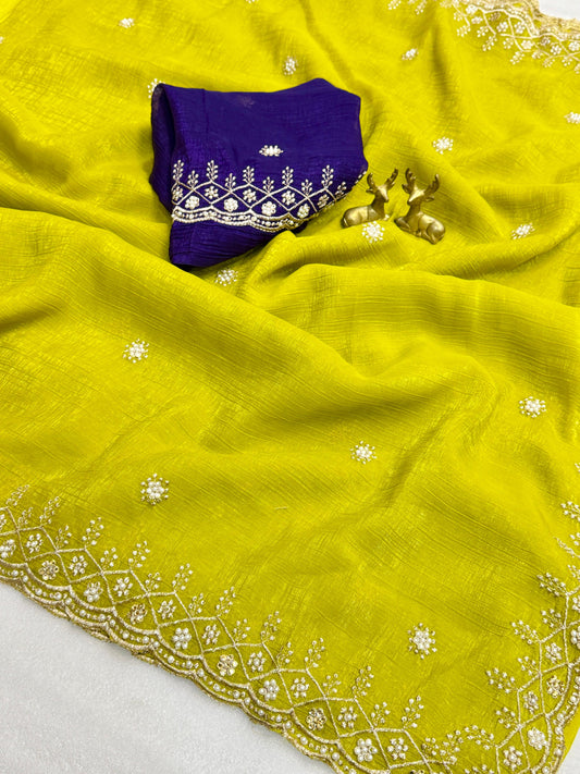 Chiffon Silk Saree with beautiful embroidery in lemon color