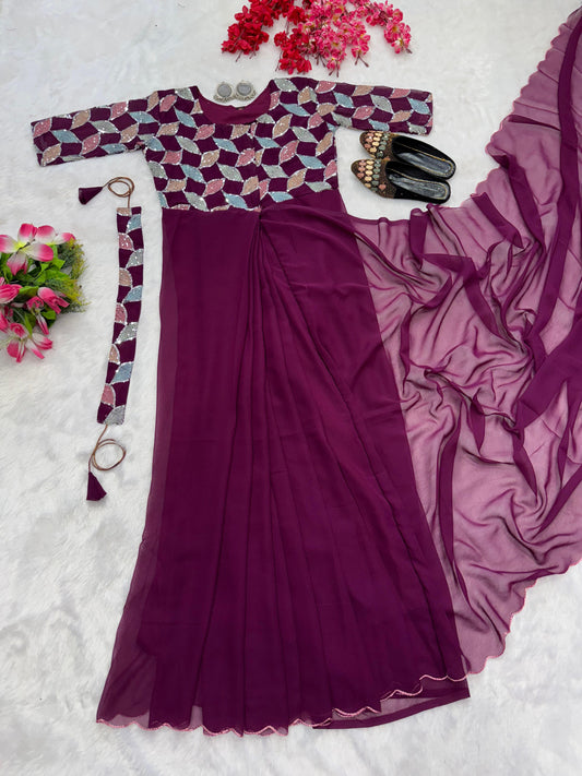 Purple color beautiful trending zip nd go embroidery saree