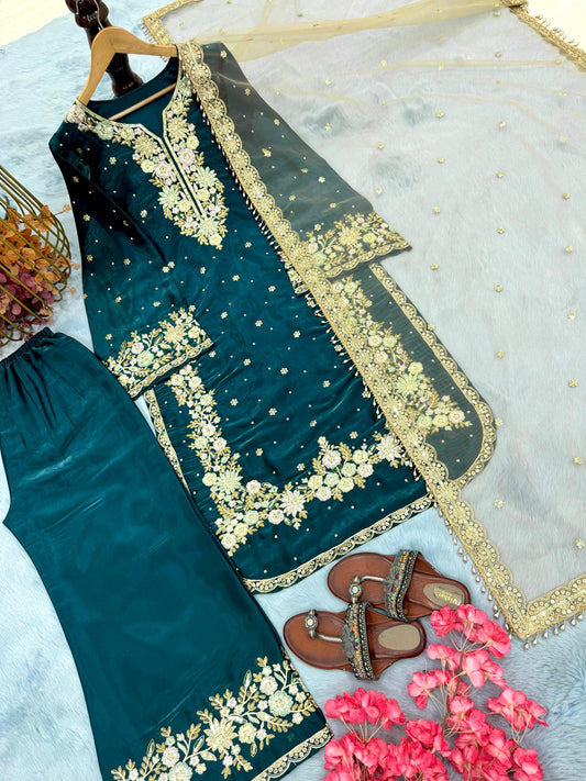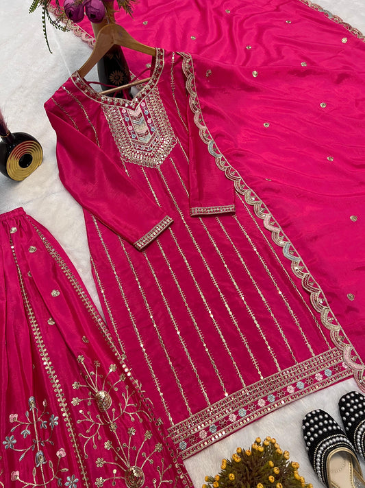 georgette embroidered coding sequence work with fancy top-plazzo dupatta set