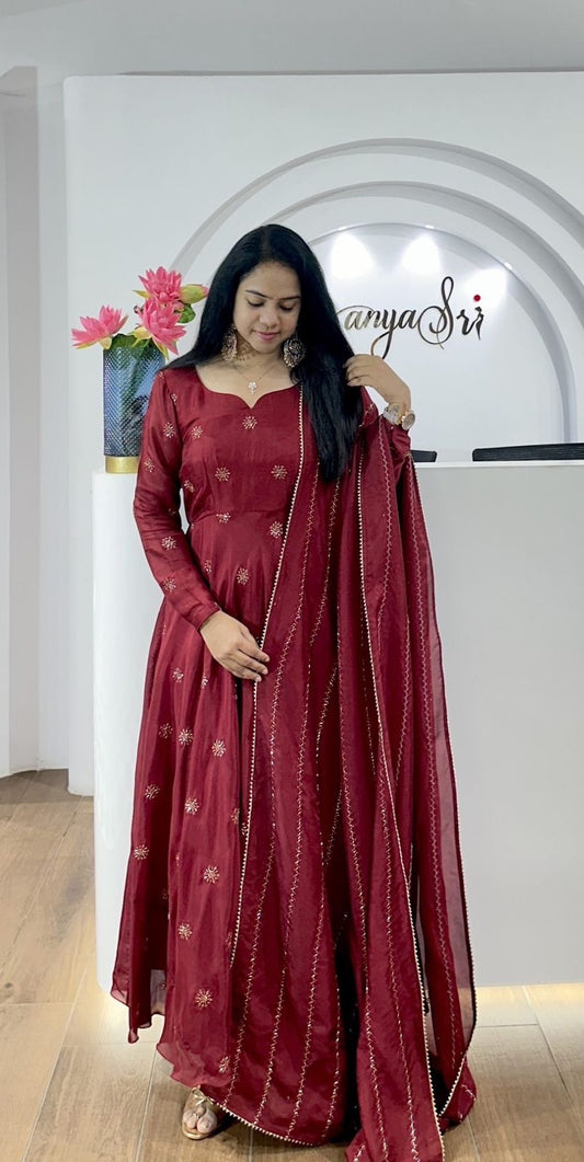 Beautiful Anarkali Gown in Chinon Fabric For Daily Wear Use in Maroon Color