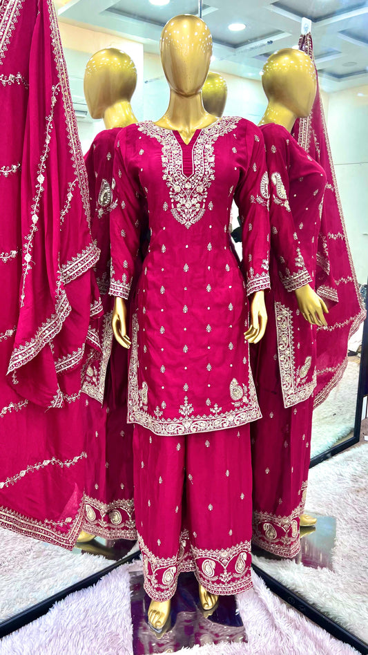 Pink Red Color Beautiful Plazo Suit In Chinon Fabric