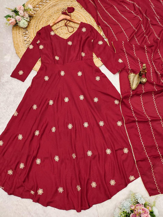 Beautiful Anarkali Gown with dupatta IN Chinon Fabric Maroon color