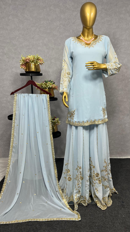 Sky BLue Color Beautiful 3 Piece Kurti With Sharara And Dupatta