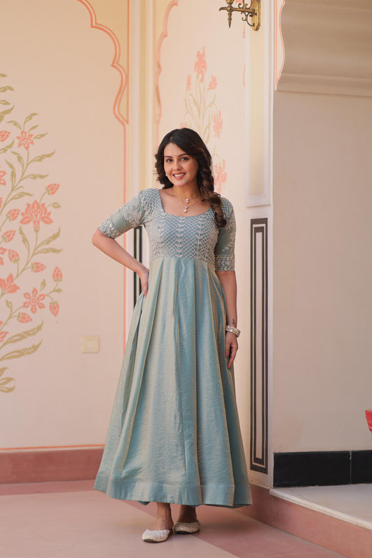 Readymade Designer Gown in Fandy silk Fabric in blue color
