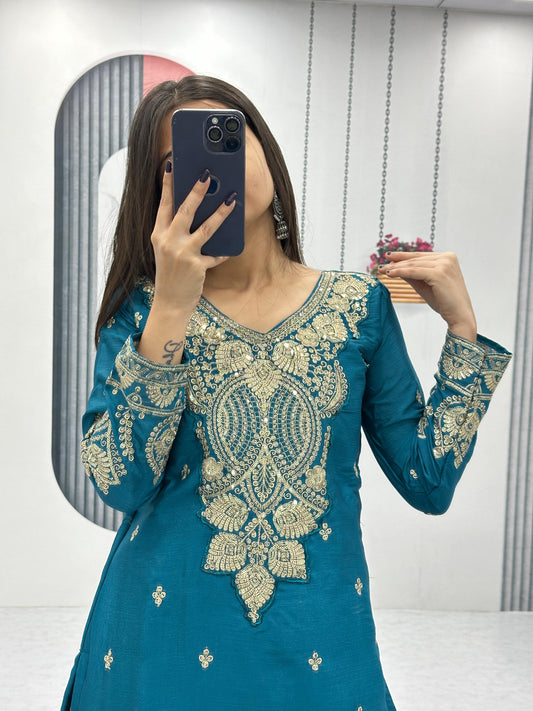 Festival Collection In Chinnon And Heavy Embroidery Sequence Work Top-Bottom And Dupatta Set