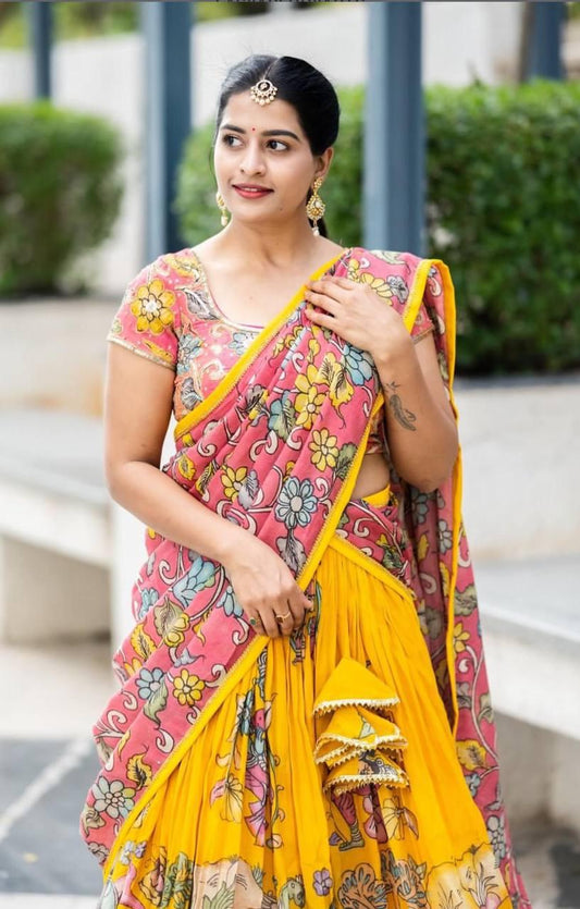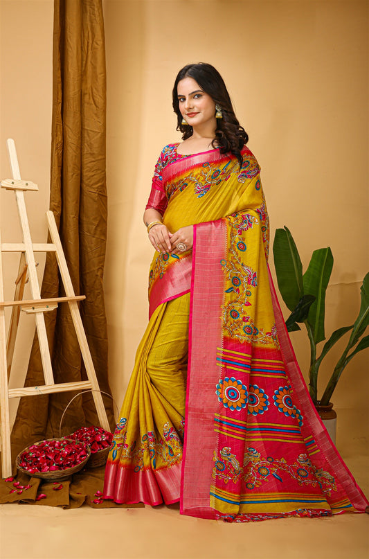 Musturd Color Cotton Silk Fabric with Kalamkari print with Kanjivaram Saree