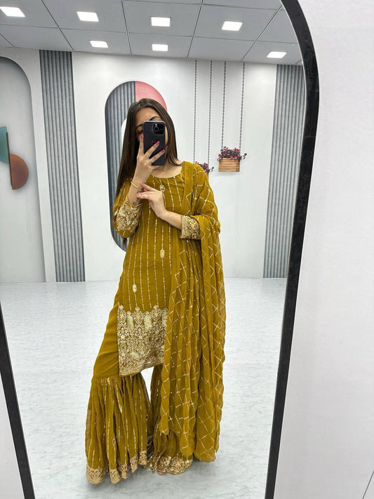 Yellow Color Beautiful Sharara Suit in Chinon Fabric