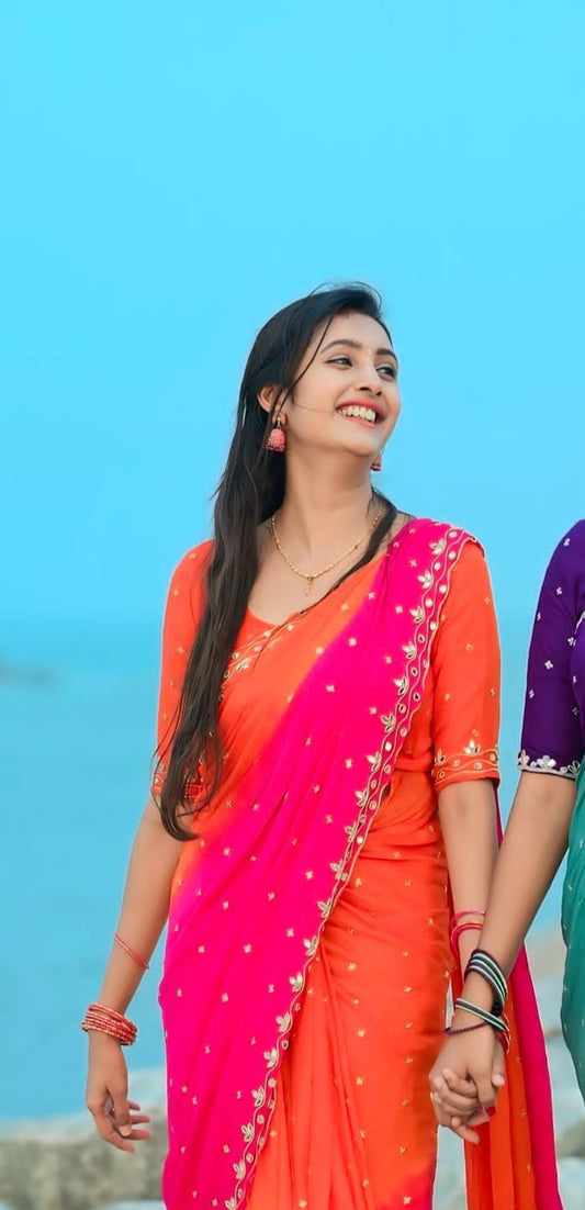 Pink Yellow Color Beautiful Chinon Fabric SAree