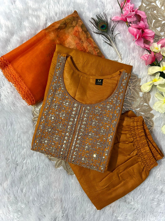 Designers Kurti Pent Dupatta Set for summer wear in orange color