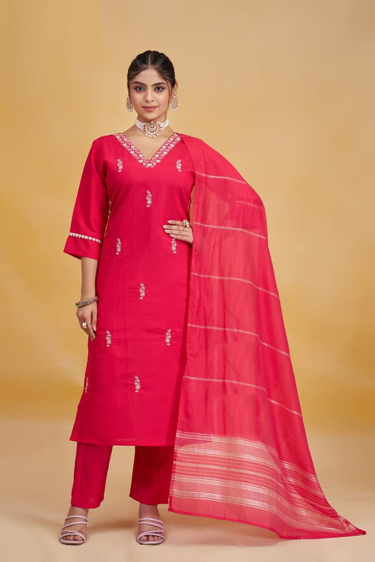 Kurta & Pant Dupatta Set in Silk Fabric In Red Color