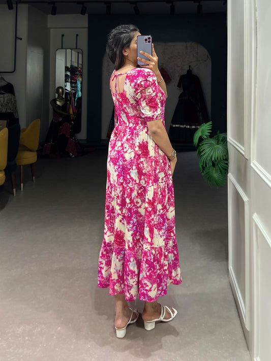 Designer Flower Print Frock In Rayon Fabric in pink color