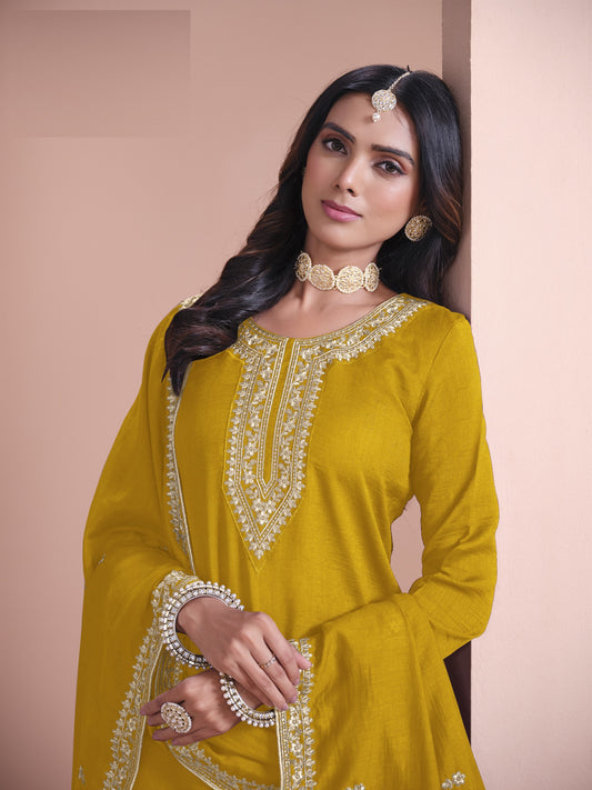 Yellow Color Partywear Plazo Suit In Silk Fabric Wedding Function