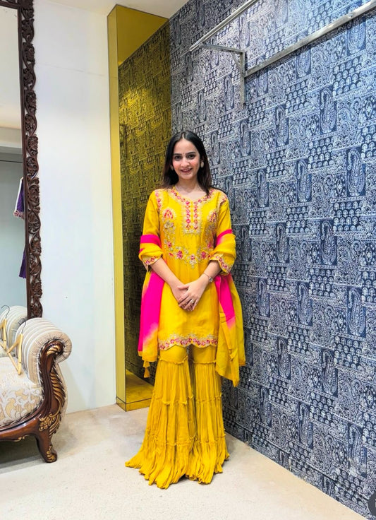 Chinon Fabric Fancy Sharara Suit in yellow color