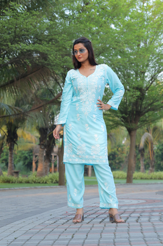 Blue Color Beautiful Summer Wear Kurti Pent Co-Ord Set