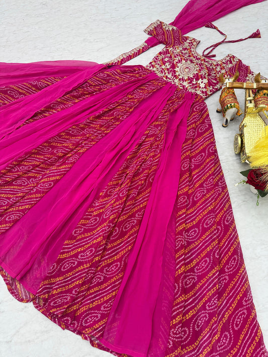 Festival Wear Bandhej Gown & Dupatta in Georgette Fabric in pink color