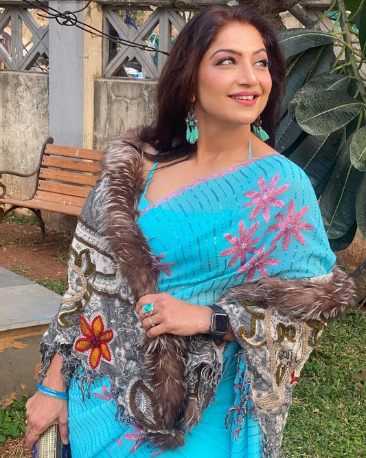 Trending Georgette Fabric With Embroidery Work Border Full Flair Stitched Saree-Gown in blue color