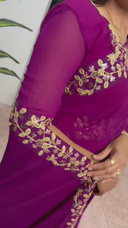 Trending Georgette Fabric With Embroidery Work Border Full Flair Stitched Saree-Gown in purple color
