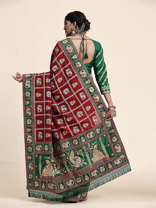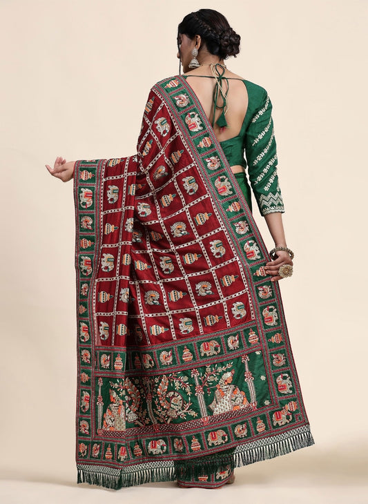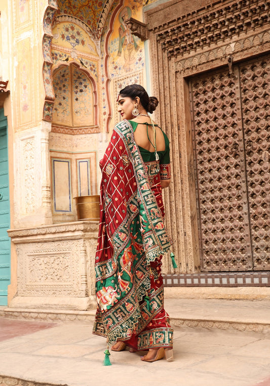 Dark Red Green Color Panetar Patola Saubhagyavati Bhava Kalash Wedding & Special Occasion Saree