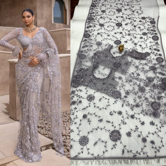 Bollywood Blockbuster Designer Saree in Net Fabric in Grey Color shade