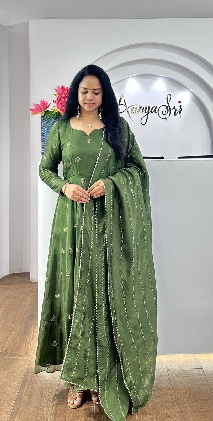 Chinnon Silk Anarkali With Jari And Sequence Embroidery Work Allover The Anarkali With Beautiful Threads And Details Fine Embroidery On Dupptta That Look's Rich And Elegant A Perfect Outfit For Wedding & Parties
