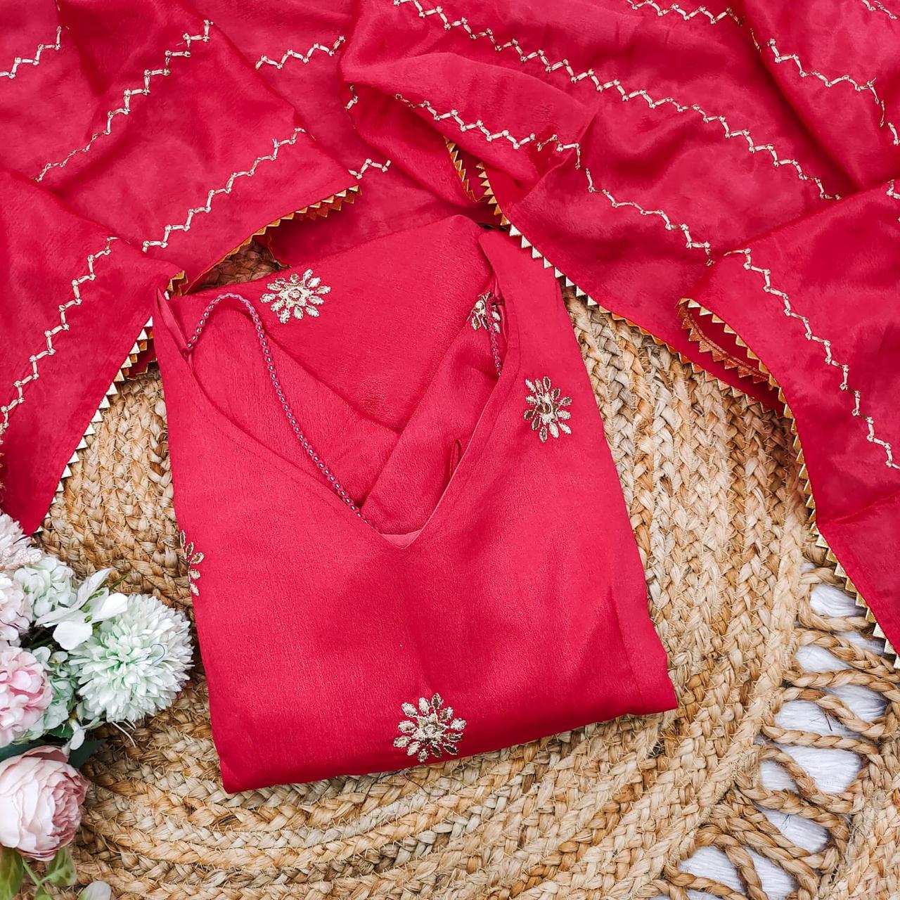 The fabric used for both the kurti and dupatta is chinon, which has a soft and flowy texture. There is intricate embroidery work all over the kurti and dupatta, featuring delicate golden motifs. The dupatta is adorned with a finely crafted border, enhancing its elegance.