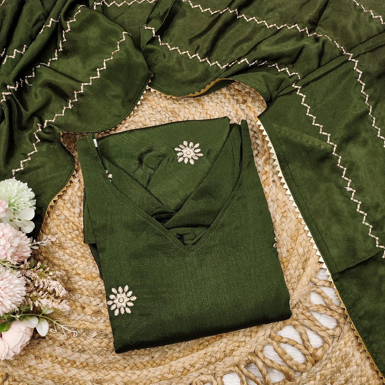 The fabric used for both the kurti and dupatta is chinon, which has a soft and flowy texture. There is intricate embroidery work all over the kurti and dupatta, featuring delicate golden motifs. The dupatta is adorned with a finely crafted border, enhancing its elegance.