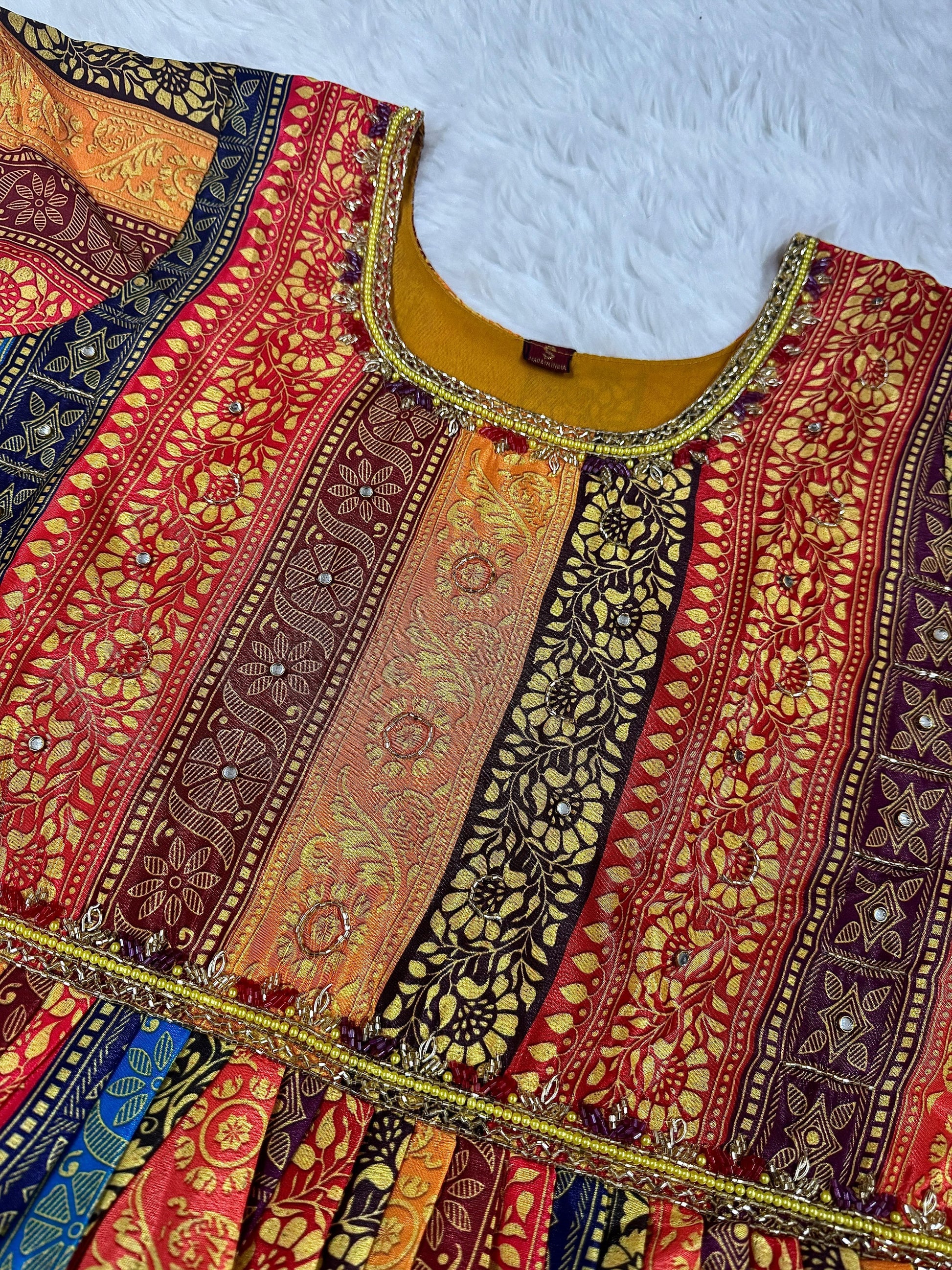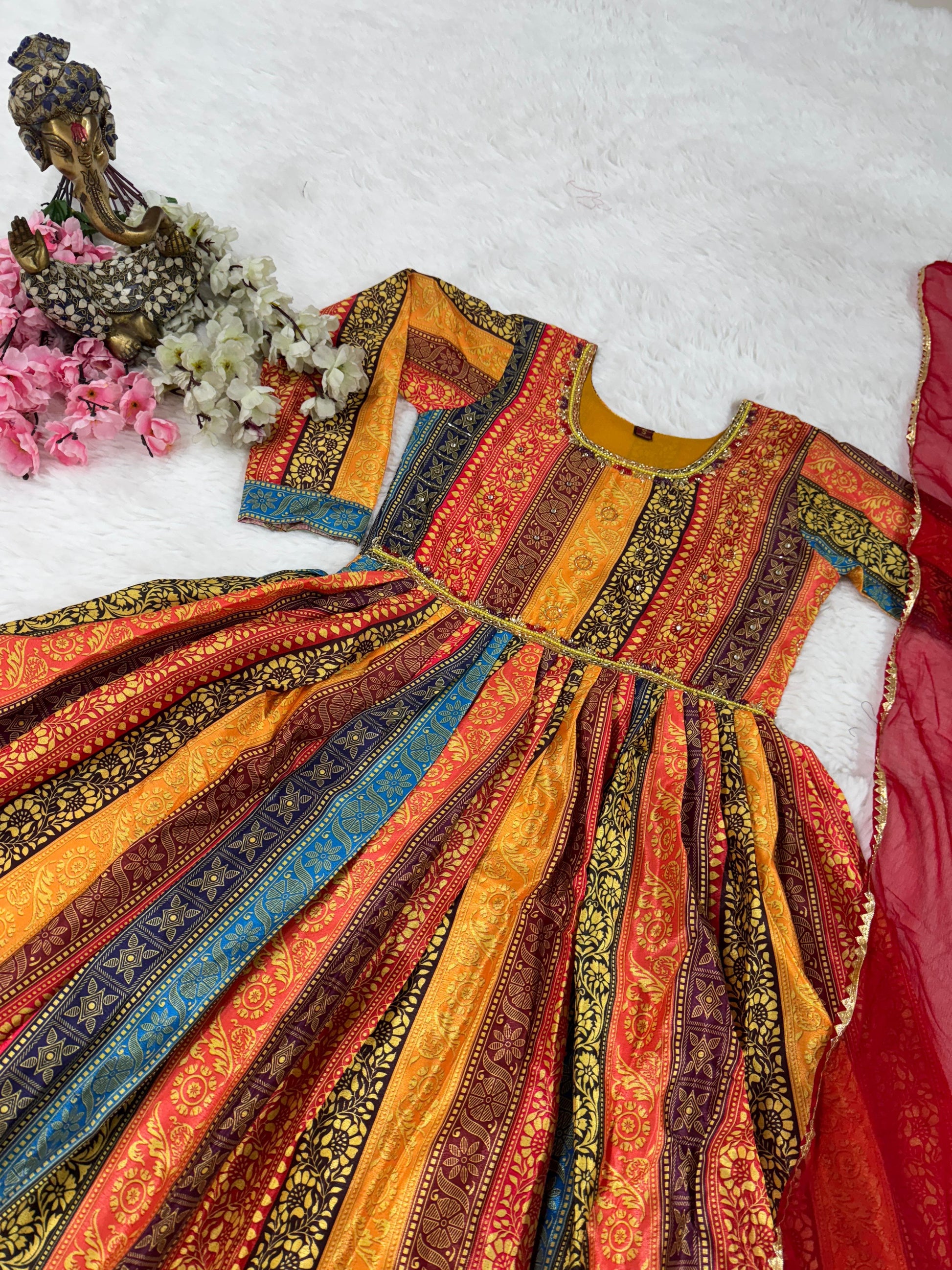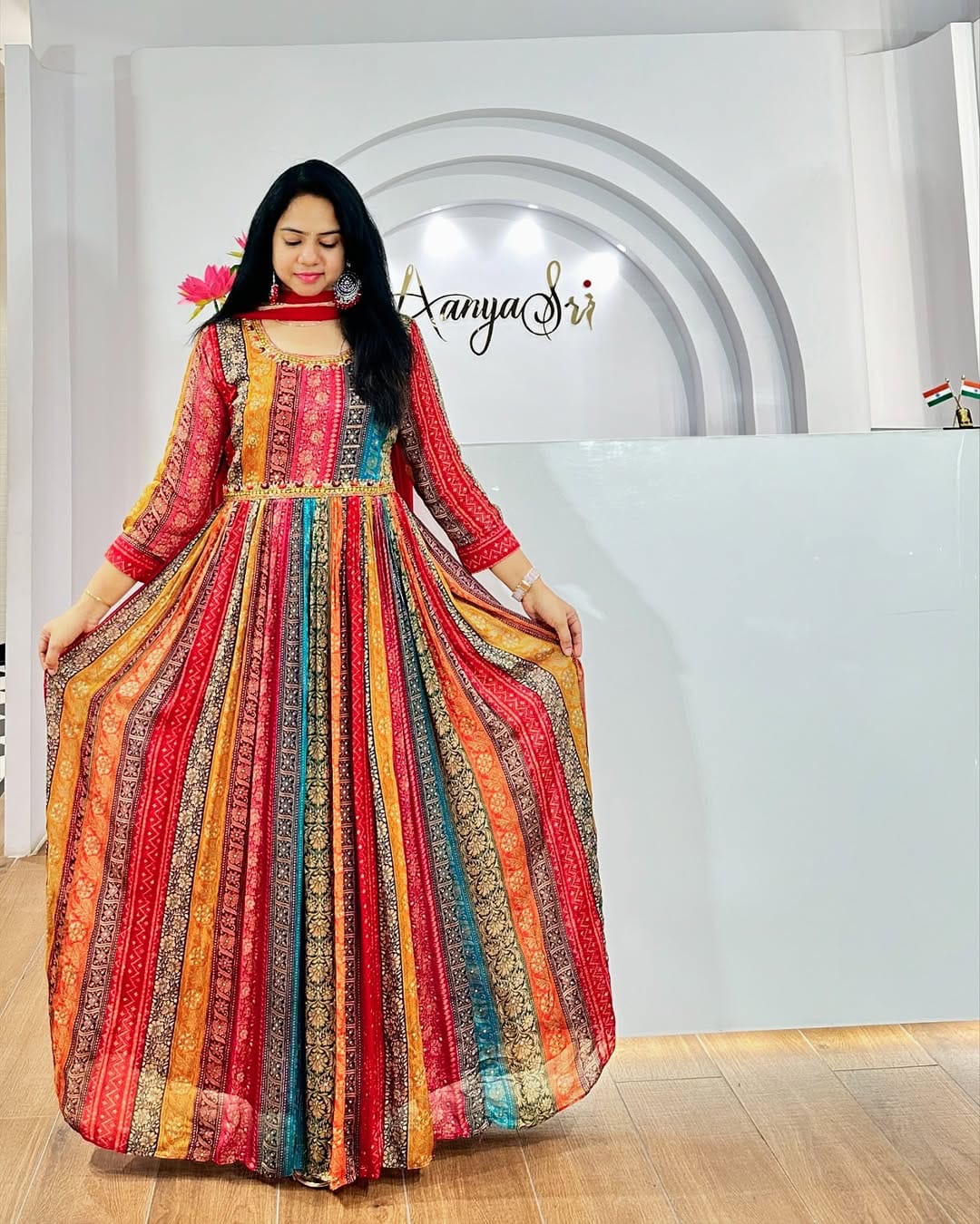 Gown Fabric -This Set Features A Pure Chinon With Colorful Print And Hand Work For Attractive Look