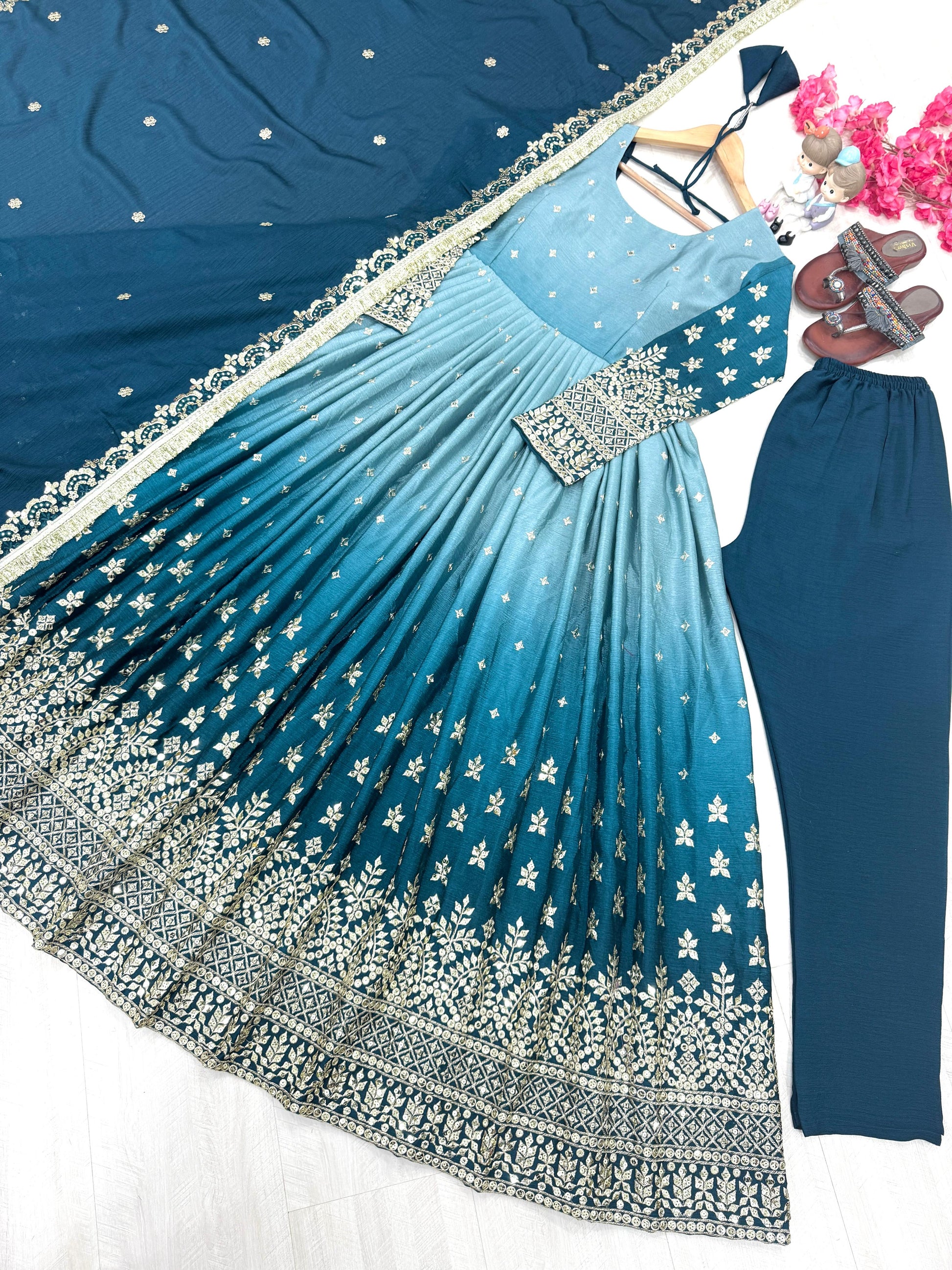 Beautiful Designer Sky Blue Color Partywear Dress in Chinon Fabric