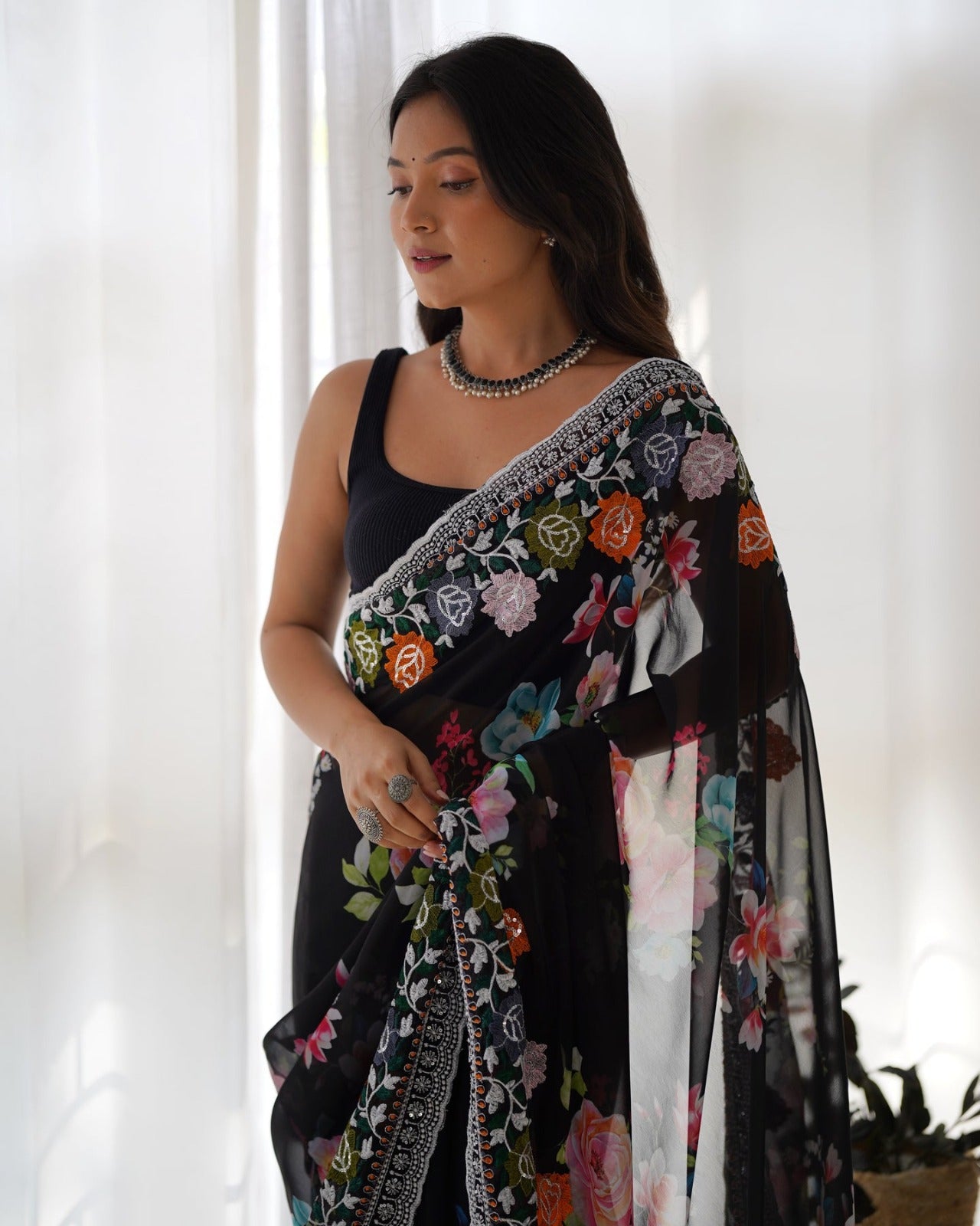 Beautiful Flowers Digital Print With Multi Dori Work Saree in Black