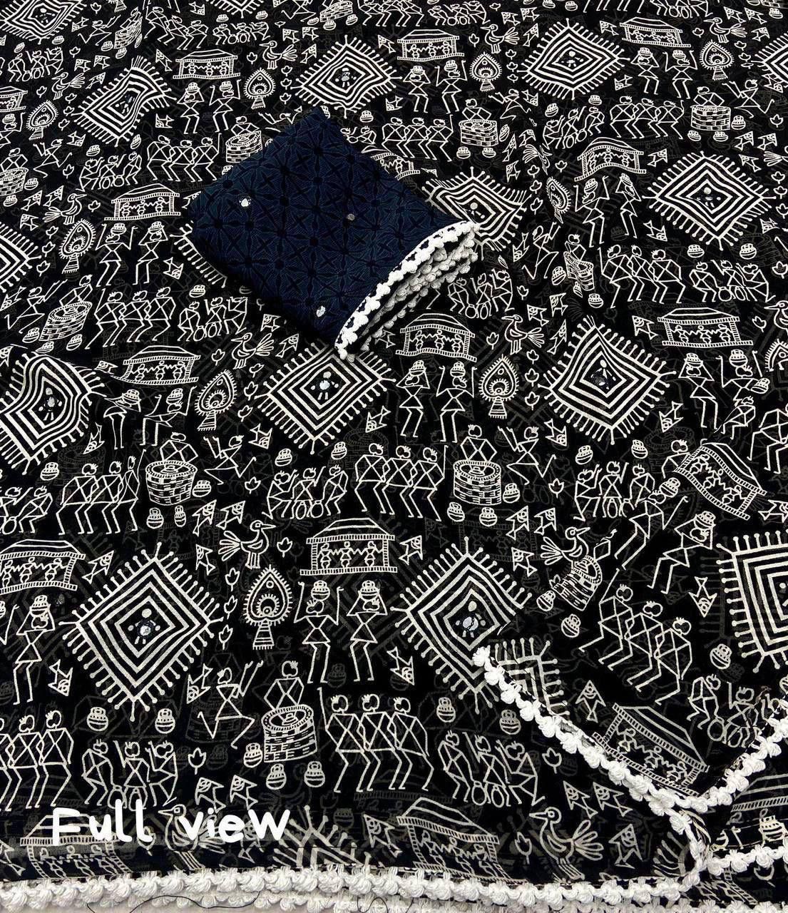 [Light Weight Fabric And Beautiful Hd Warli Style Print And Foil Mirror Work And Attractive White Mezin Cotton Lace Border]
