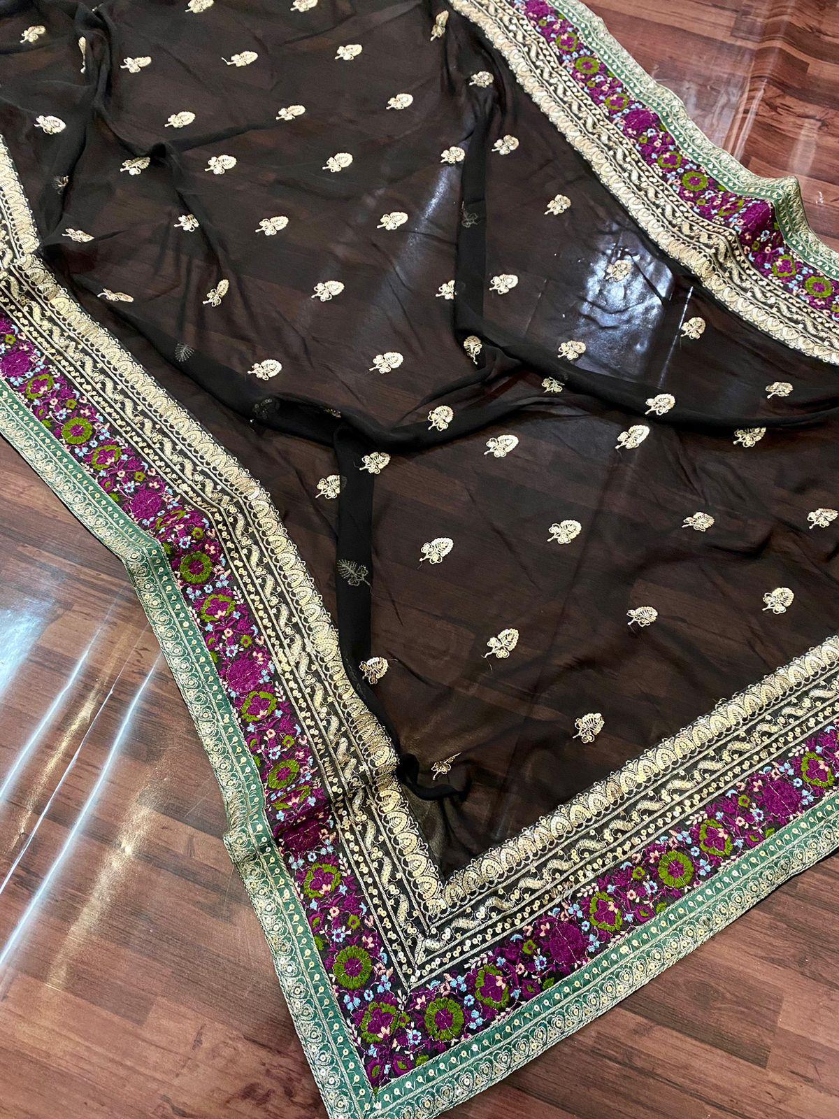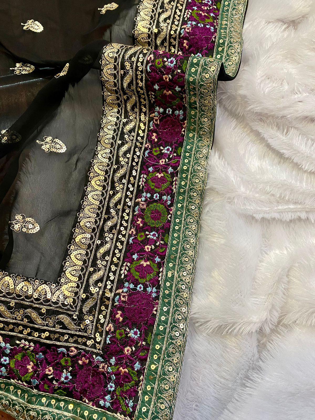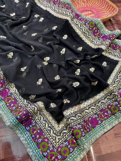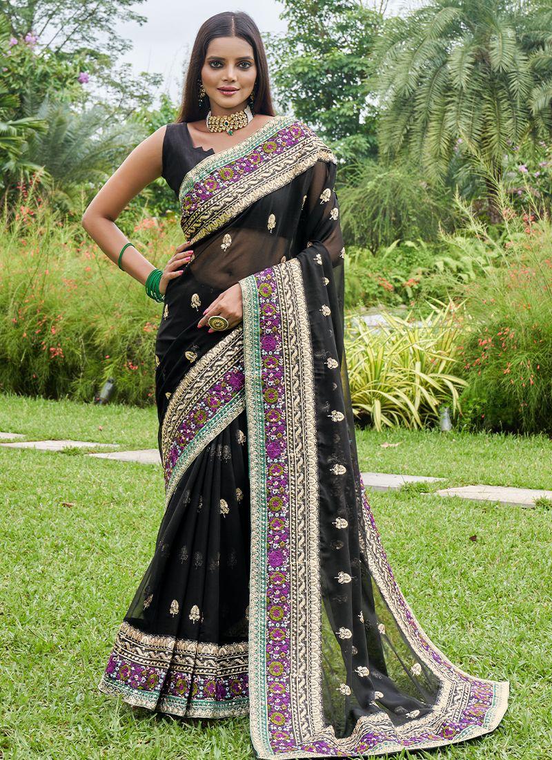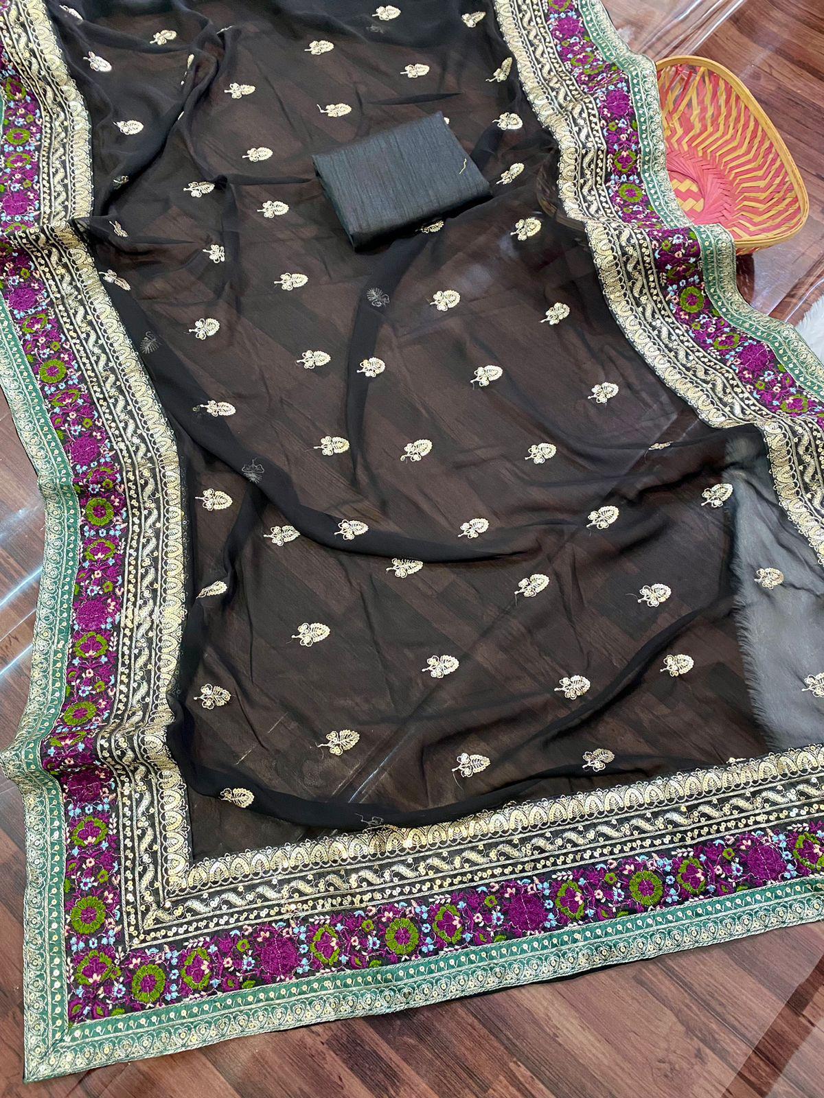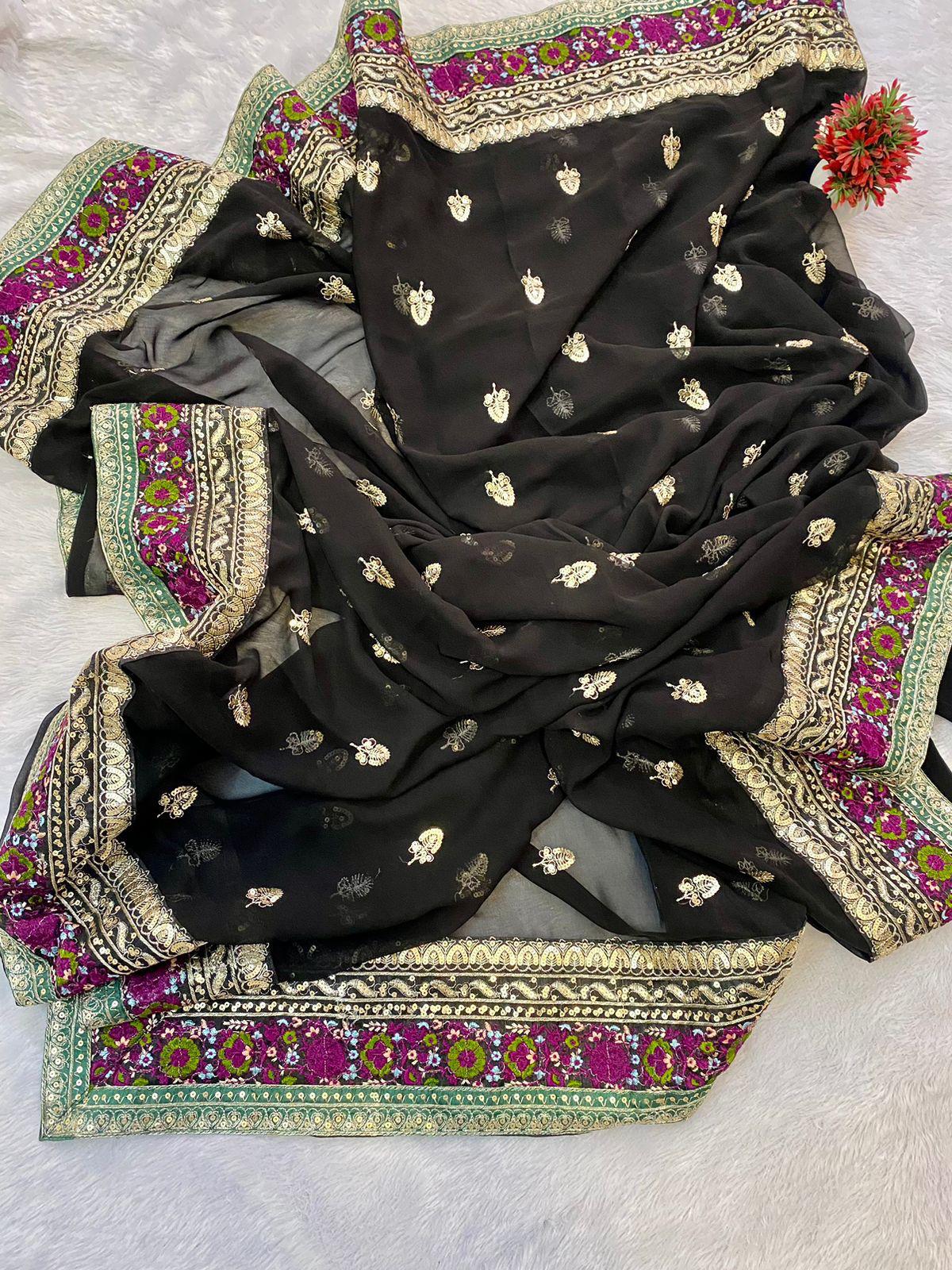 Blooming Black Pure Georgette With 16 Inch Big Embroidered Border & Sequence Butte In All Over Saree Matching Silk Blouse