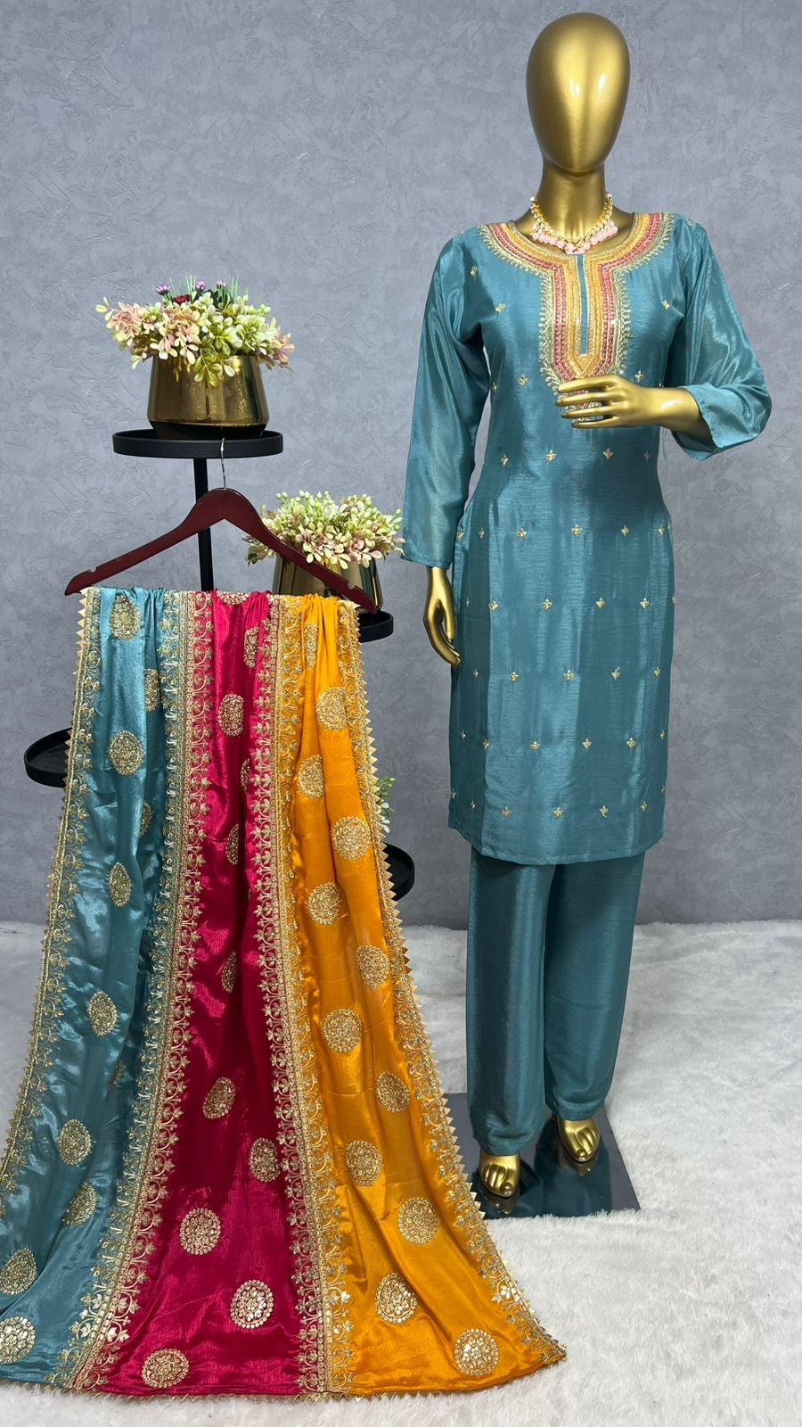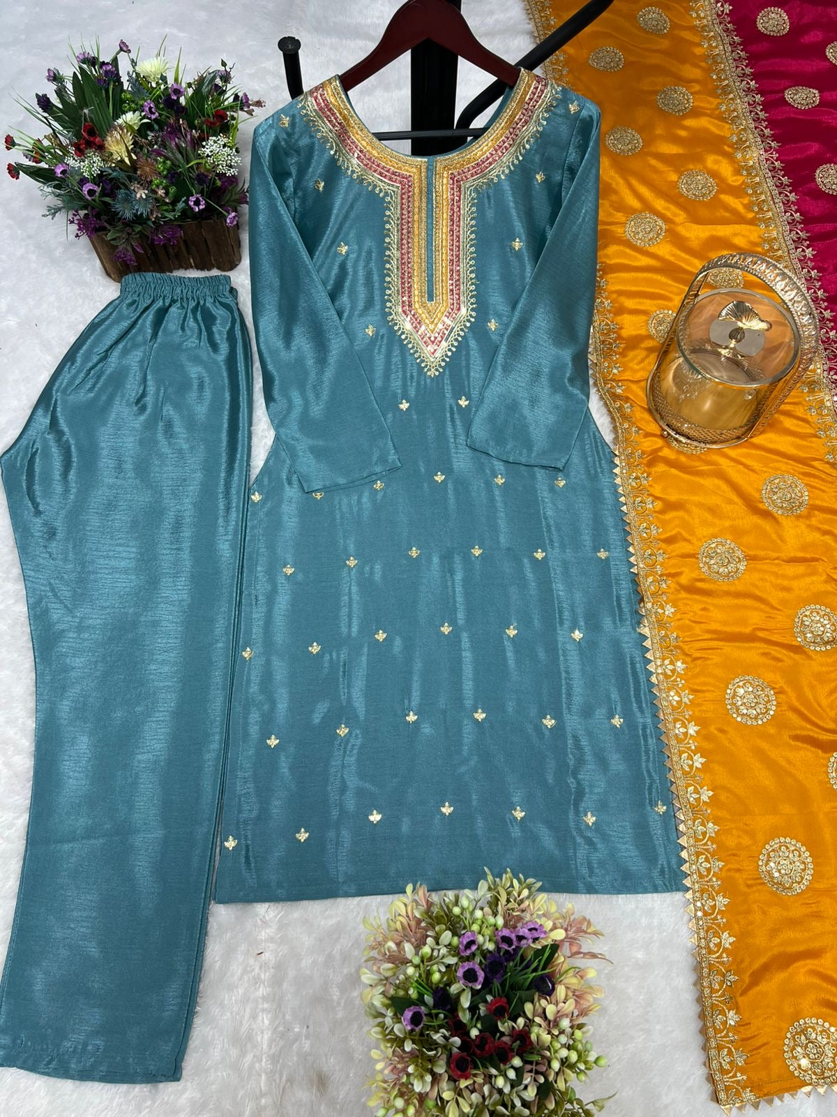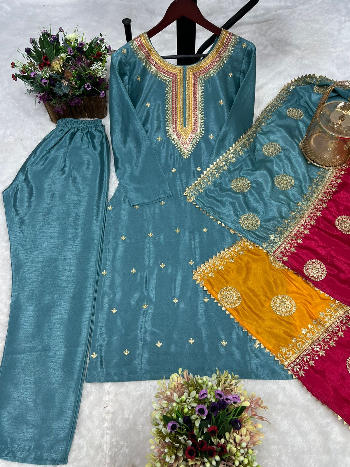 Blue Color Beautiful Partywear Suit In Chinon Fabric
