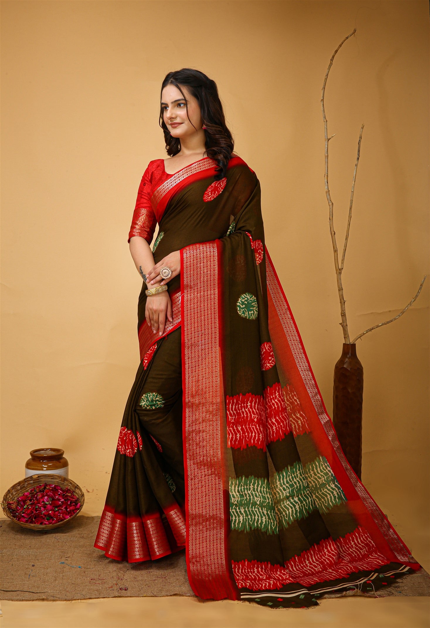 Fabric-Saree-Soft Blooming Marshmallow Fabric Saree with Jacquard Border and Contrast Blouse (6.30m with print blouse)