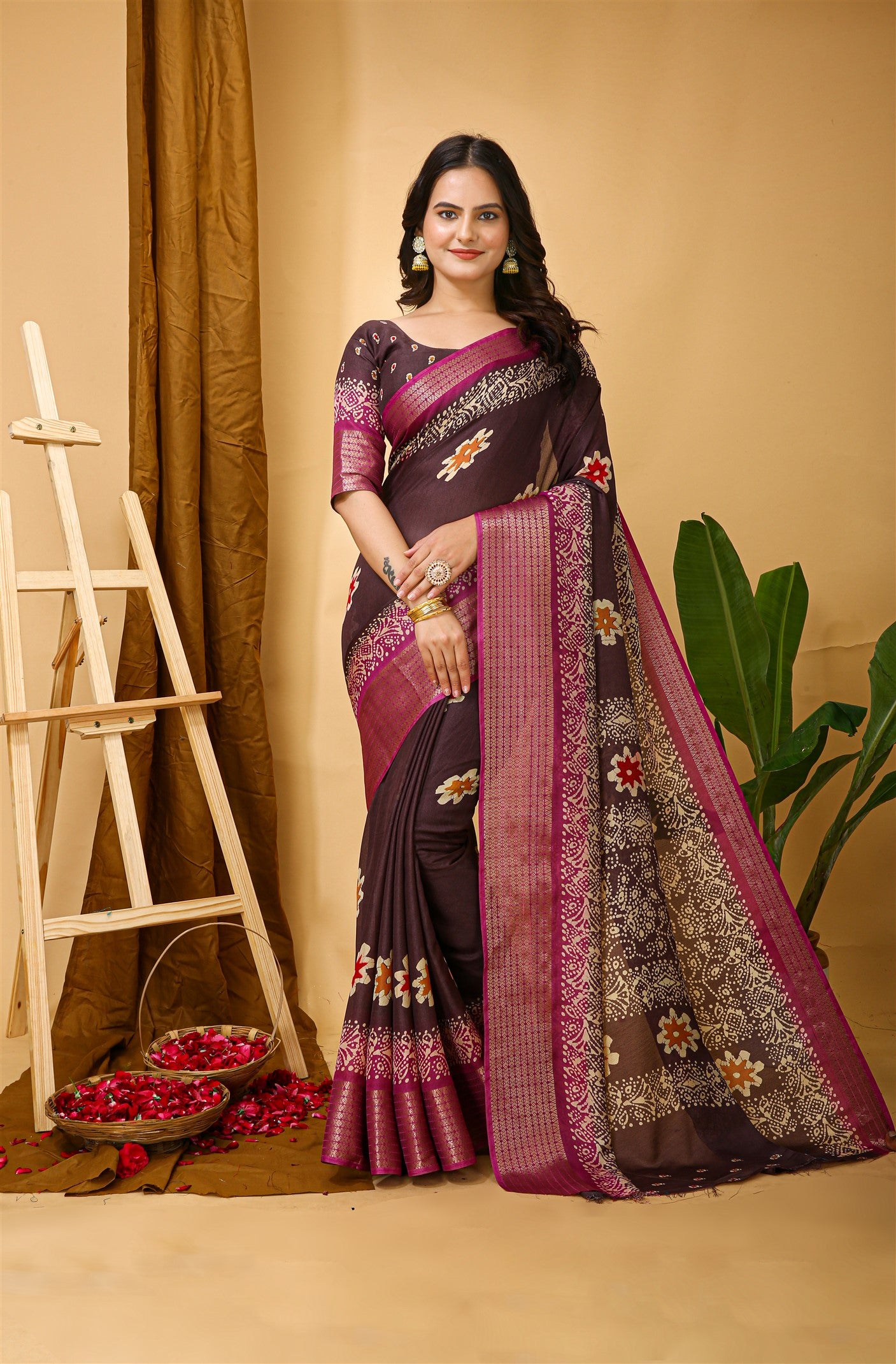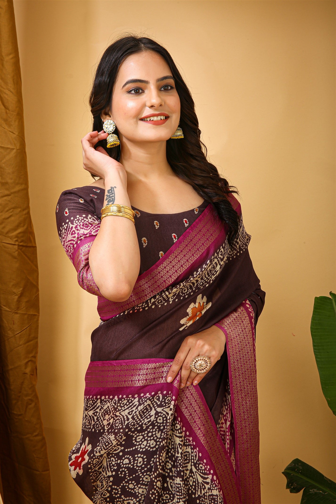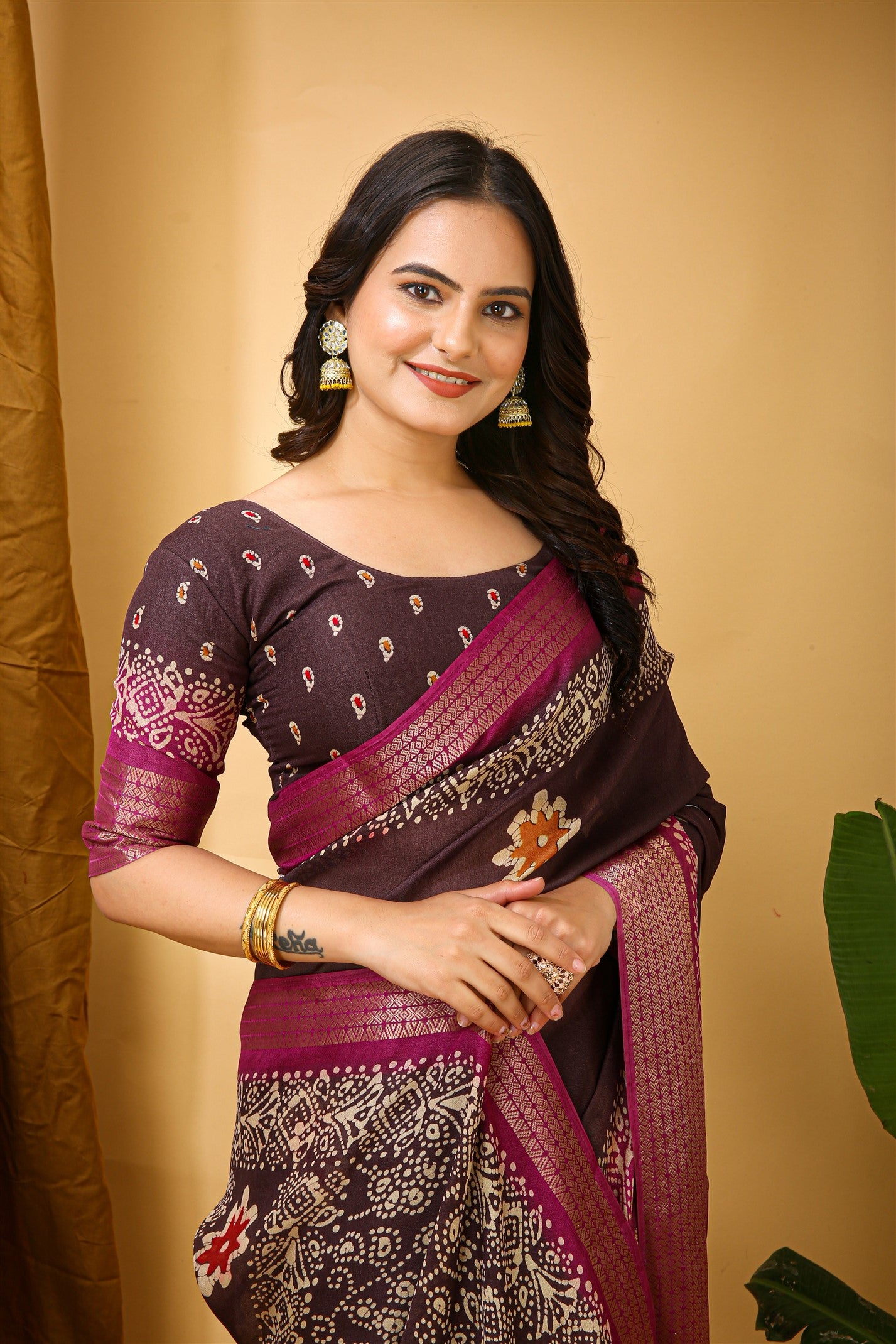 Dark Brown Color Soft Blooming Marshmallow Fabric Kalamkari print Kanjivaram Saree