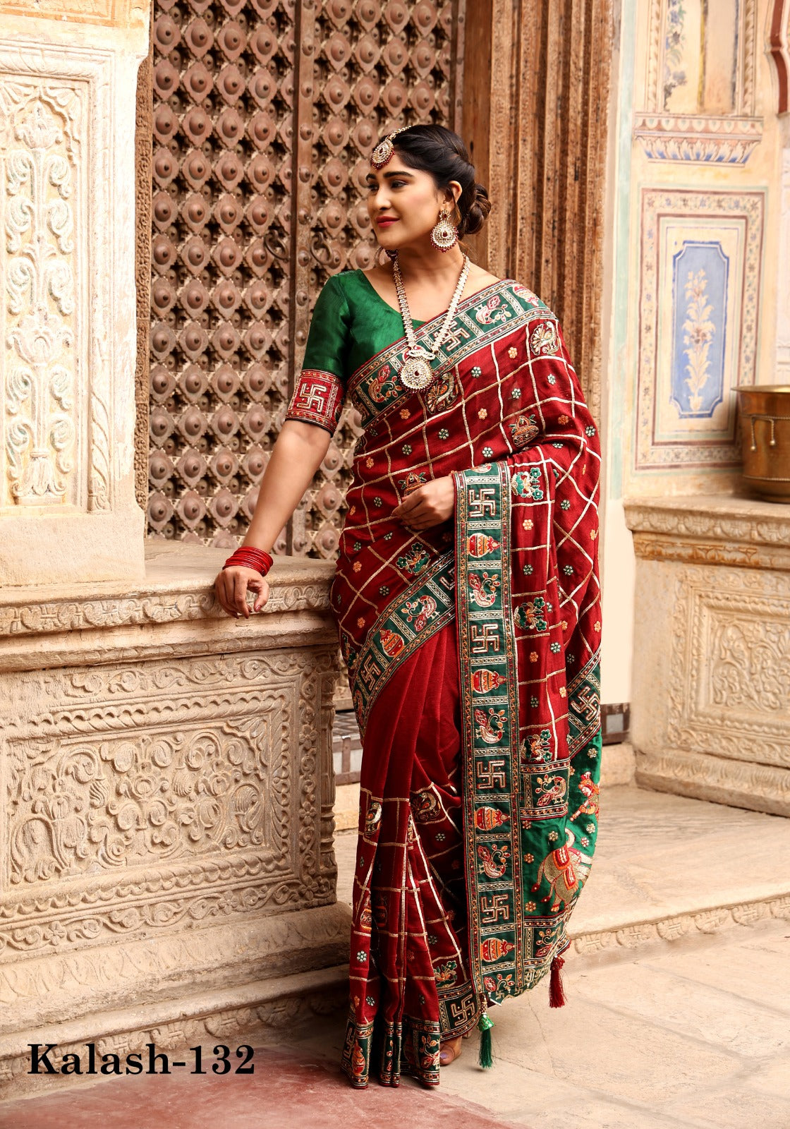 Dark Red Green Color Panetar Patola Saubhagyavati Bhava Kalash Wedding & Special Occasion Saree