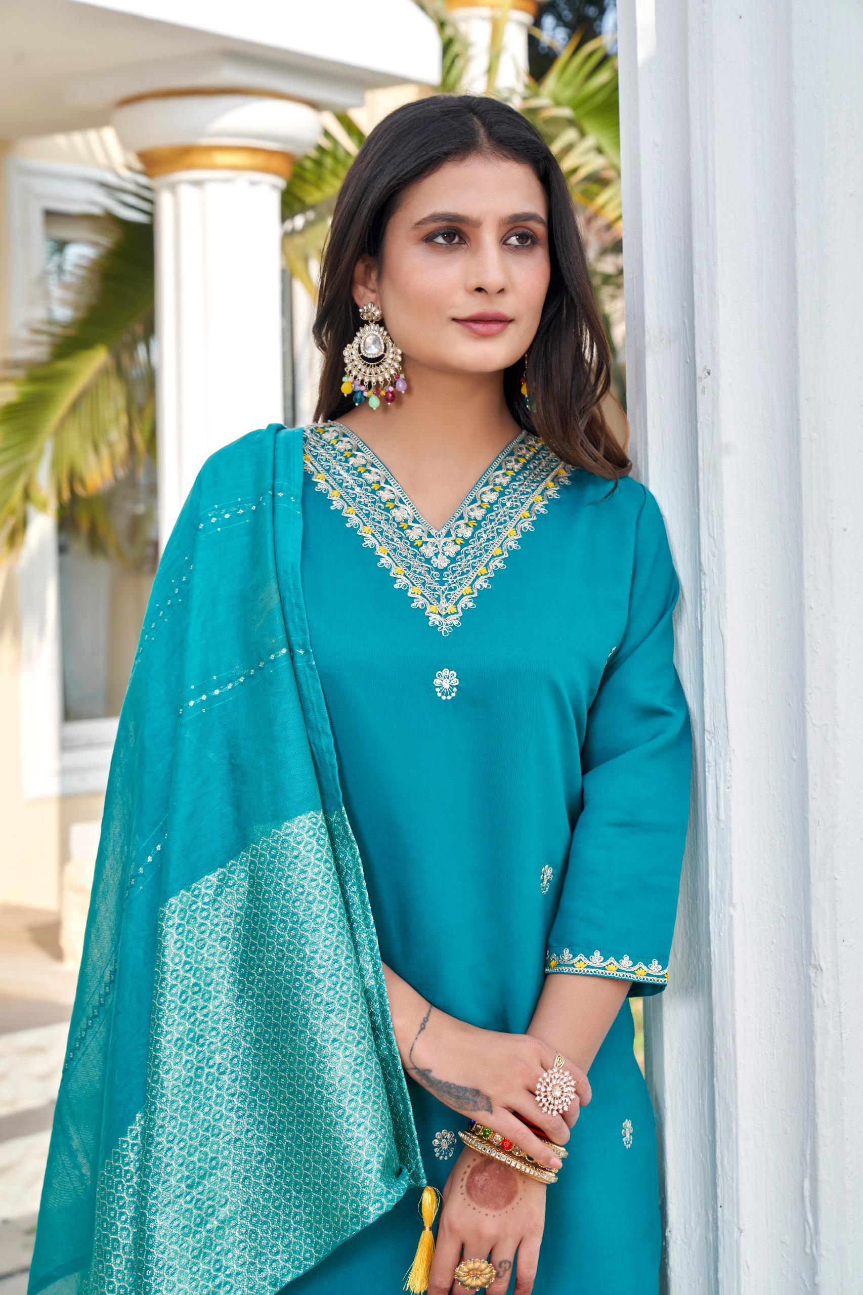 designers kurti pent dupatta set in roman silk fabric