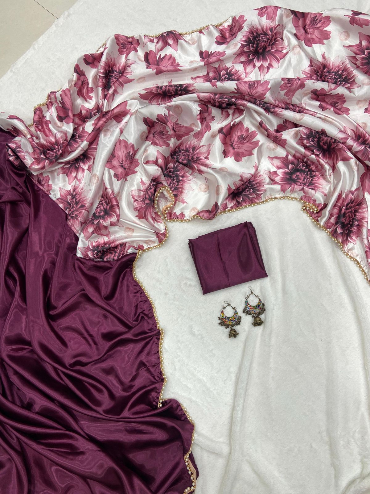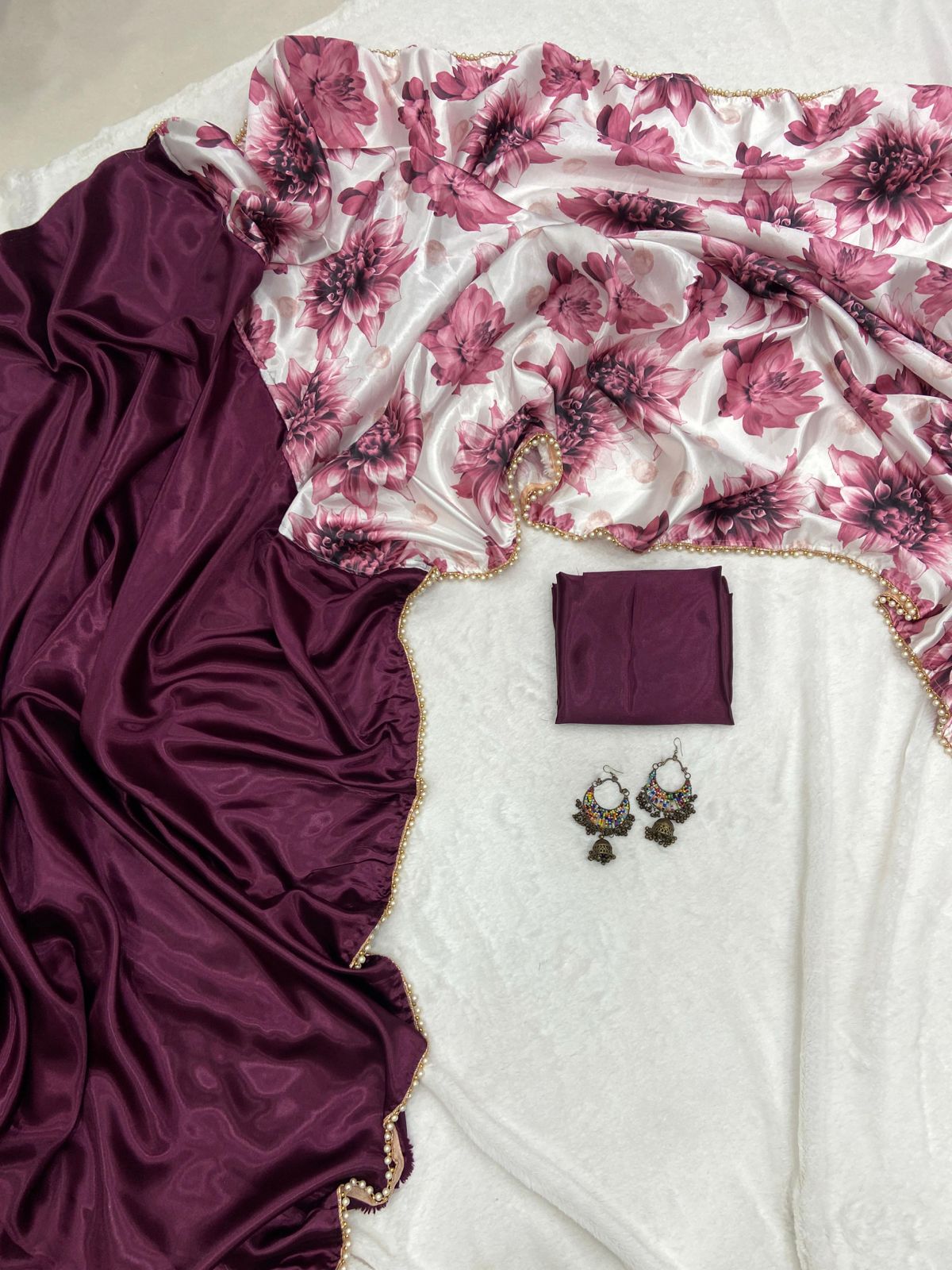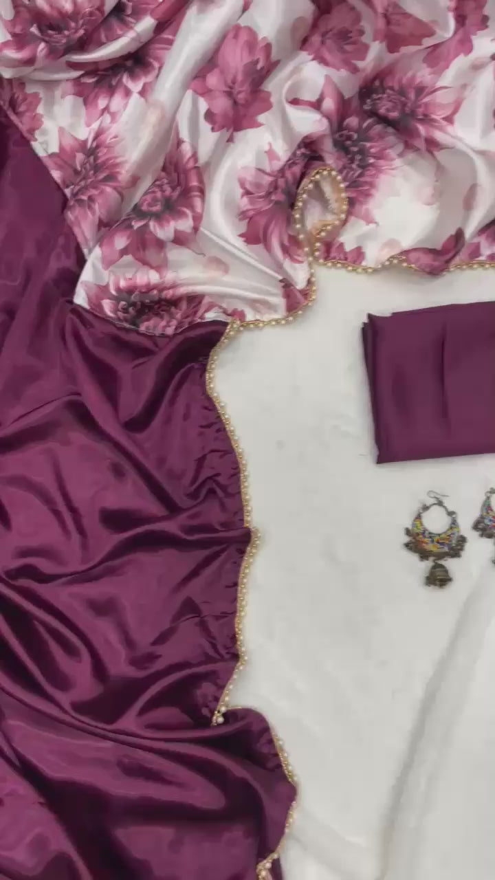 Stay Beautiful With Our New Half Half Satin Saree Collection With Beautiful Flower Printed Pallu And Pearl Lace