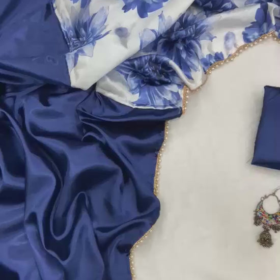 Half Half Satin Saree Collection With Beautiful Flower Print in blue color