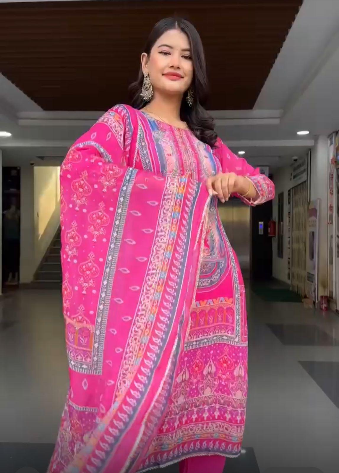The Chinon fabric used in both the kurti and dupatta provides a beautiful base for the elaborate and colourful printed designs, creating a visually rich and elegant ethnic ensemble. The designs are most likely digitally printed onto the Chinon fabric. Lightweight and Flowy Drape Soft and Smooth Texture The vibrant and rich hot pink color is well-saturated, indicating that the Chinon fabric has taken the dye effectively