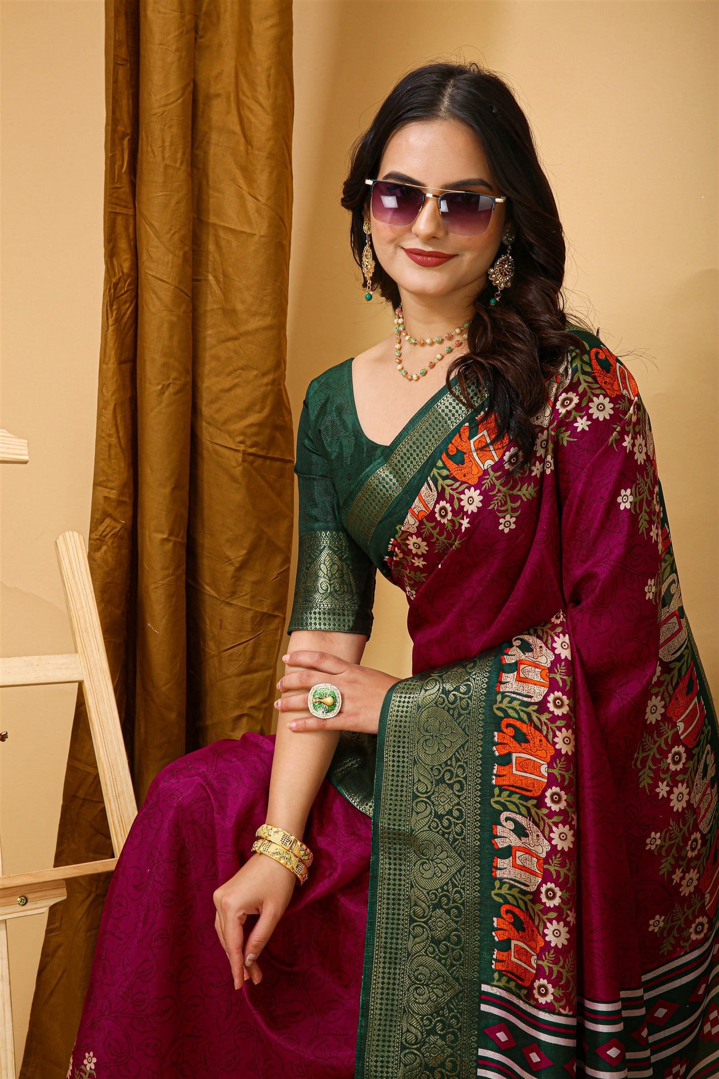 Maroon Color Cotton Silk Fabric with Kalamkari print with Kanjivaram Saree