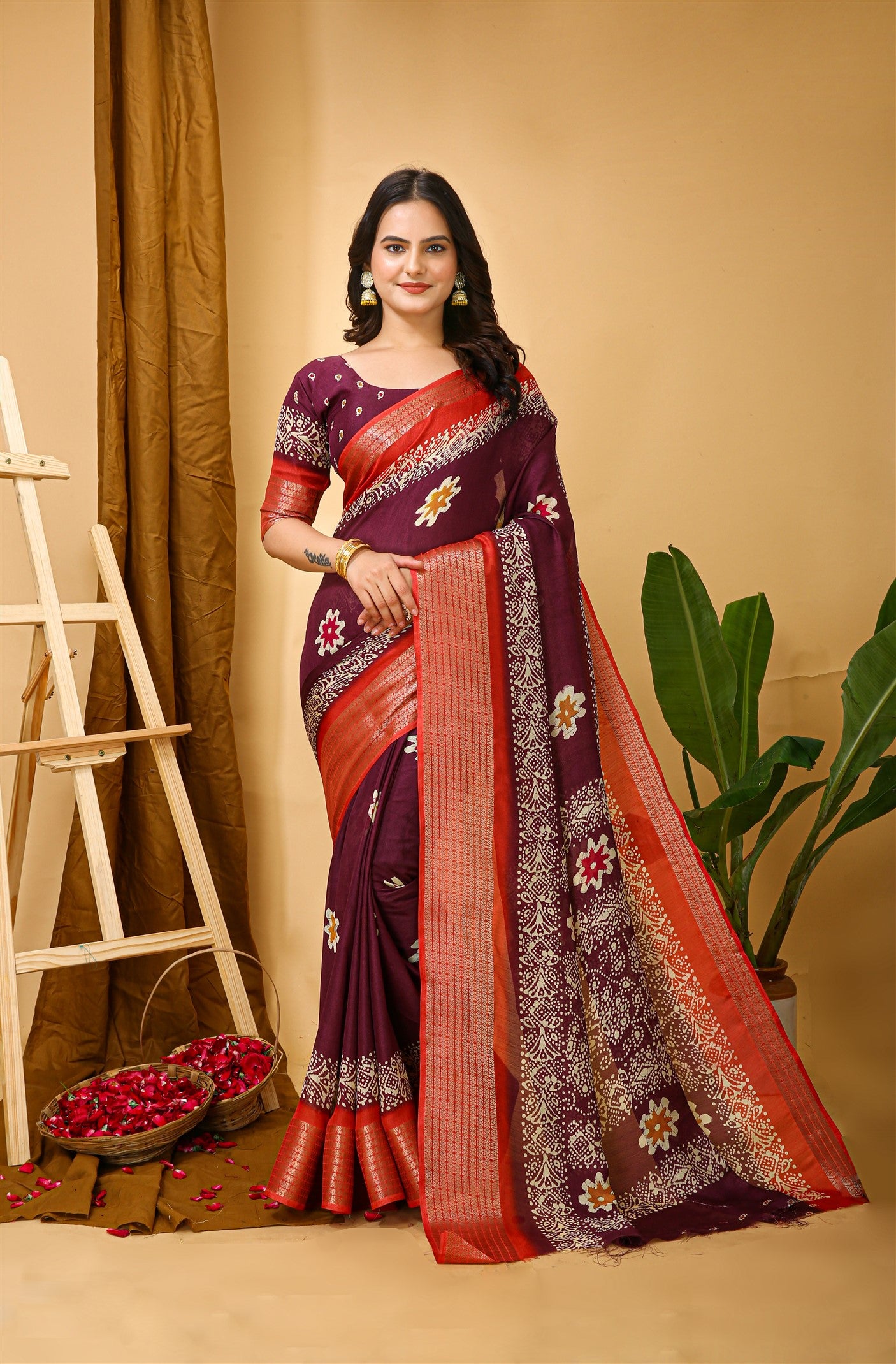 Maroon Color Soft Blooming Marshmallow Fabric Kalamkari print Kanjivaram Saree