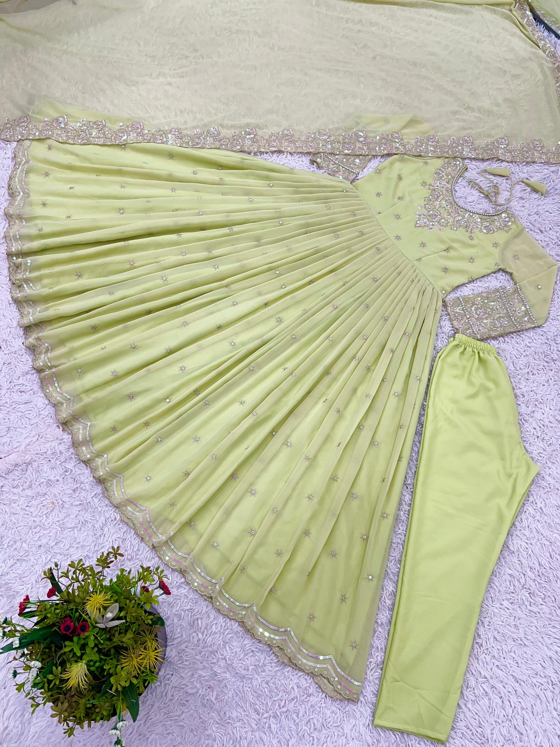 Gown Fabric : Heavy Georgette With Full Heavy Embroidery Rembo Sequence Work With Moti Work With Sleeve