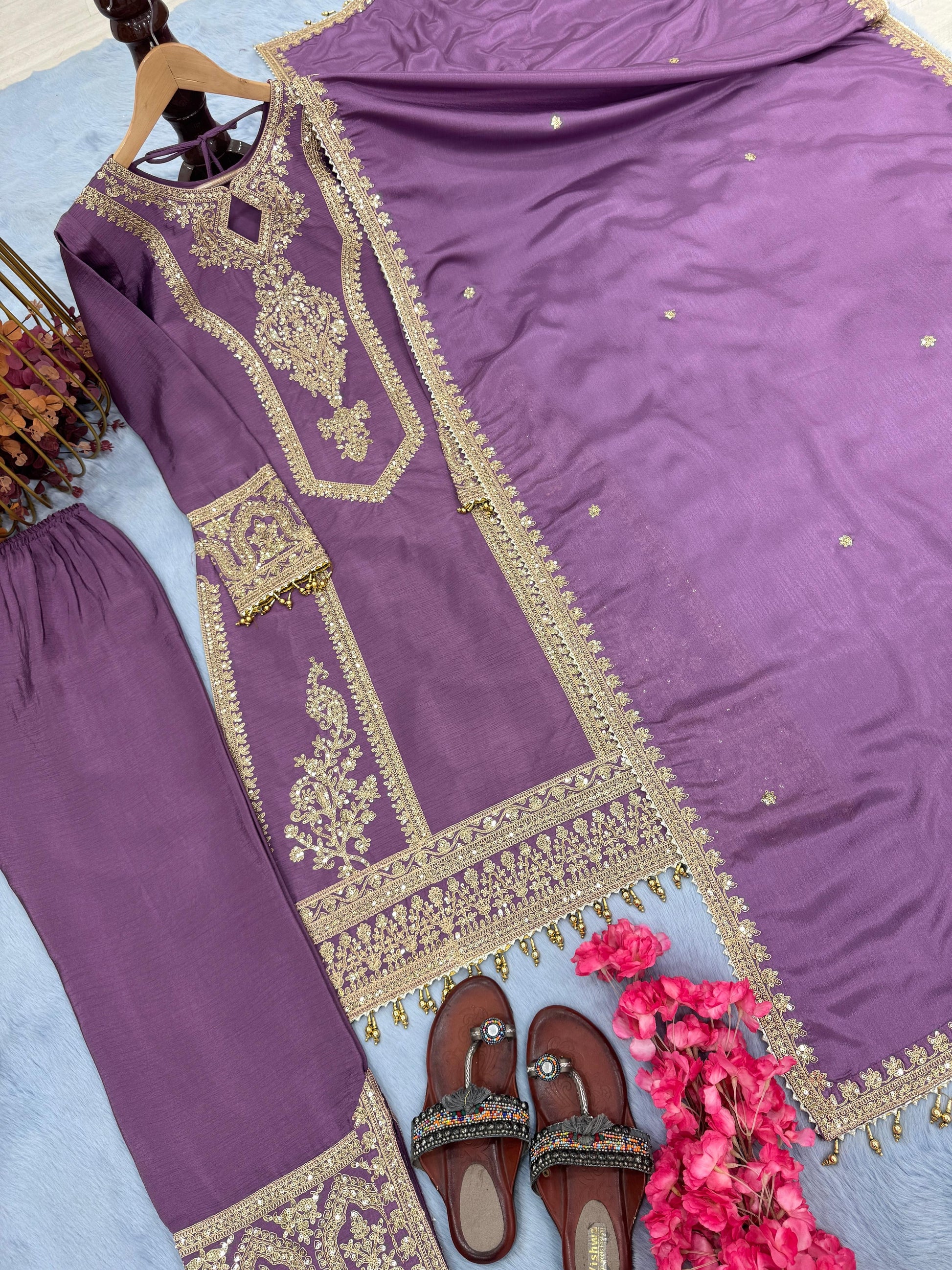 Purple Color Beautiful Partywear Chinon fabric Suit