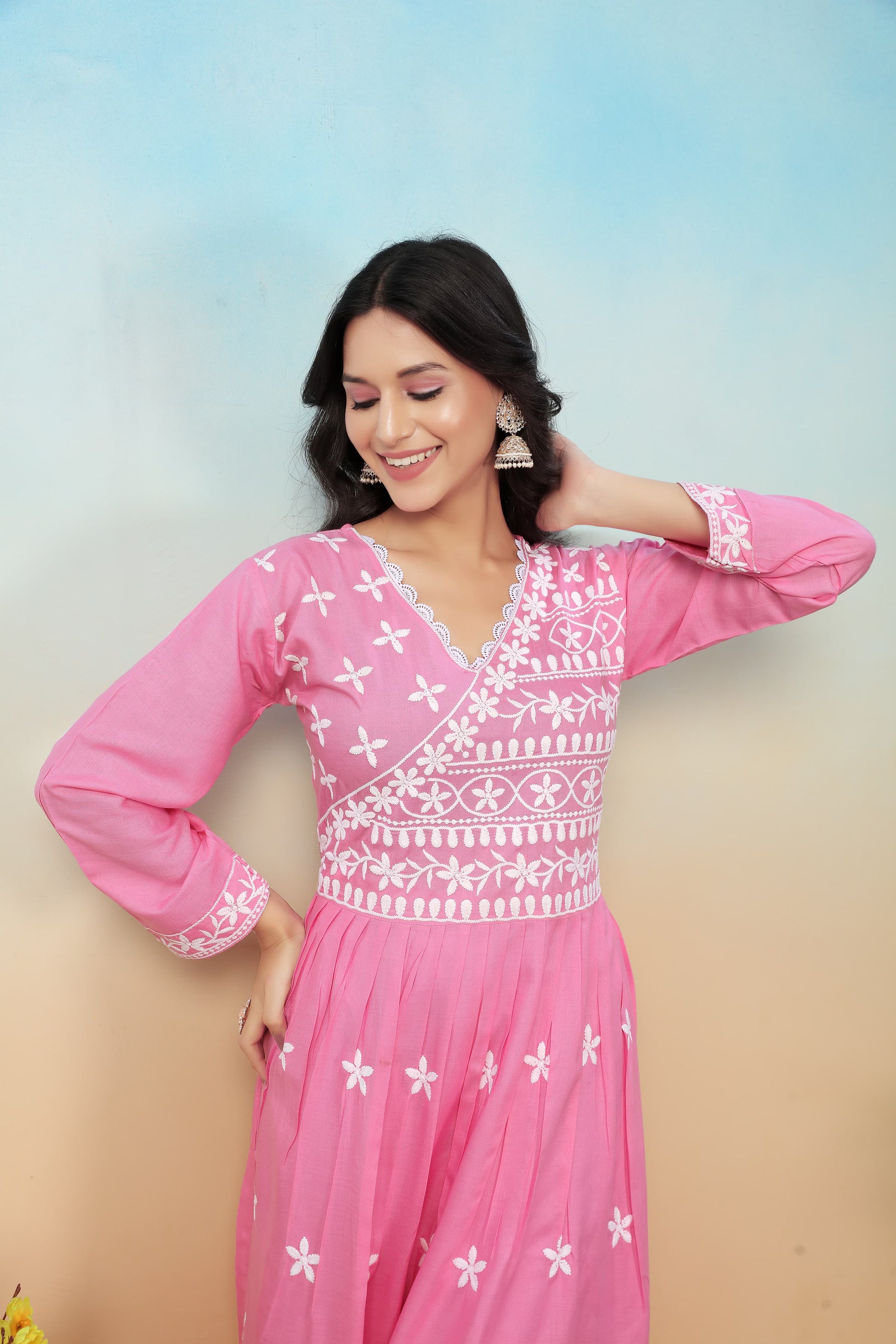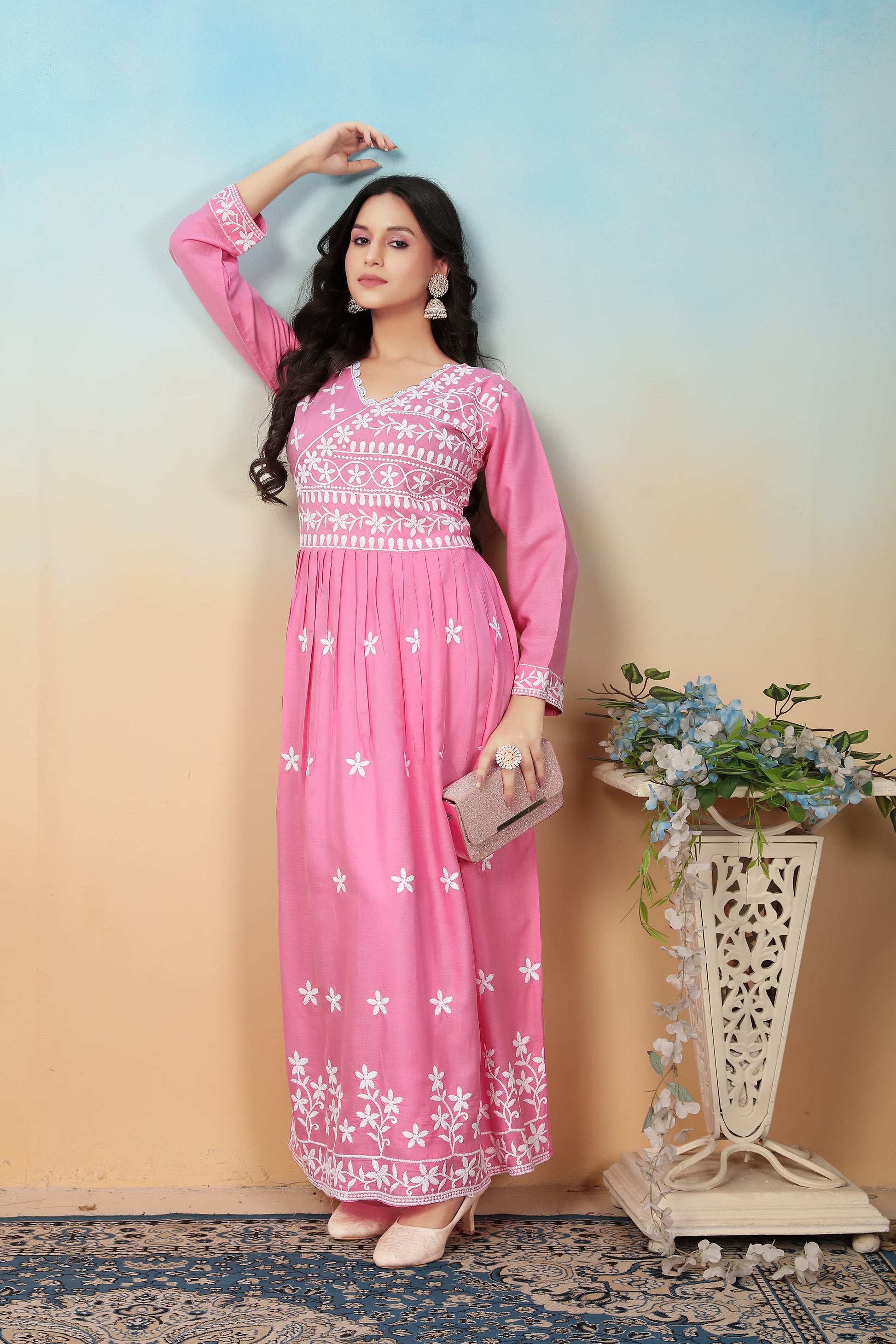 Rayon Fabric Chikankari Gown With Pant for summer wear or office wear