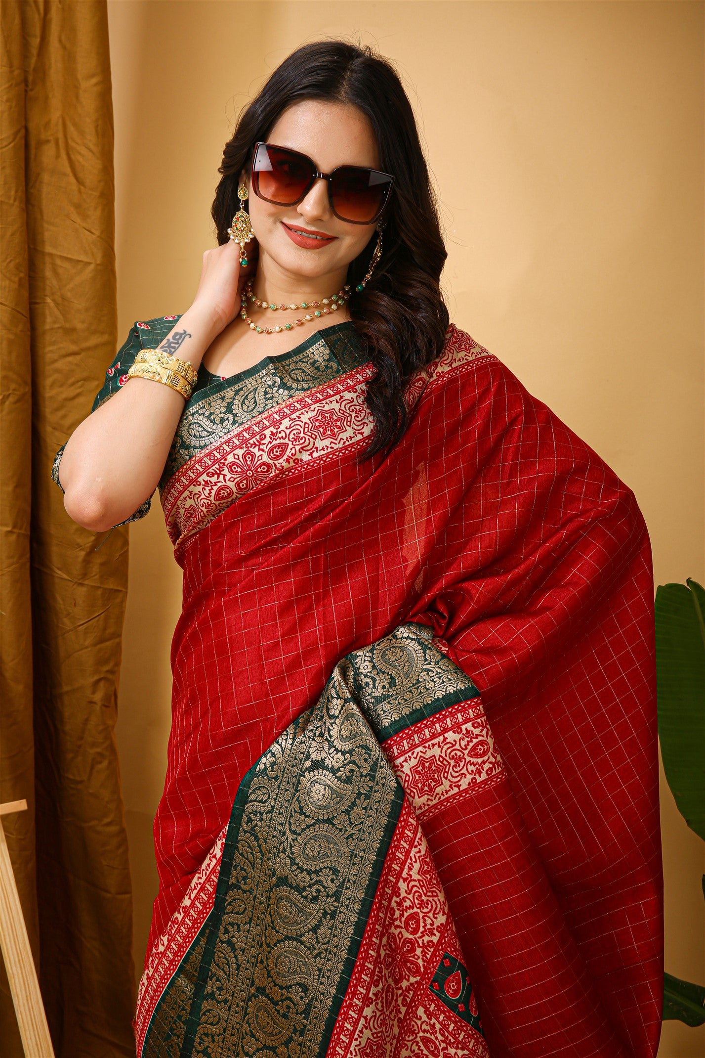 Red Color Cotton Silk Fabric with Kalamkari print with Kanjivaram Saree