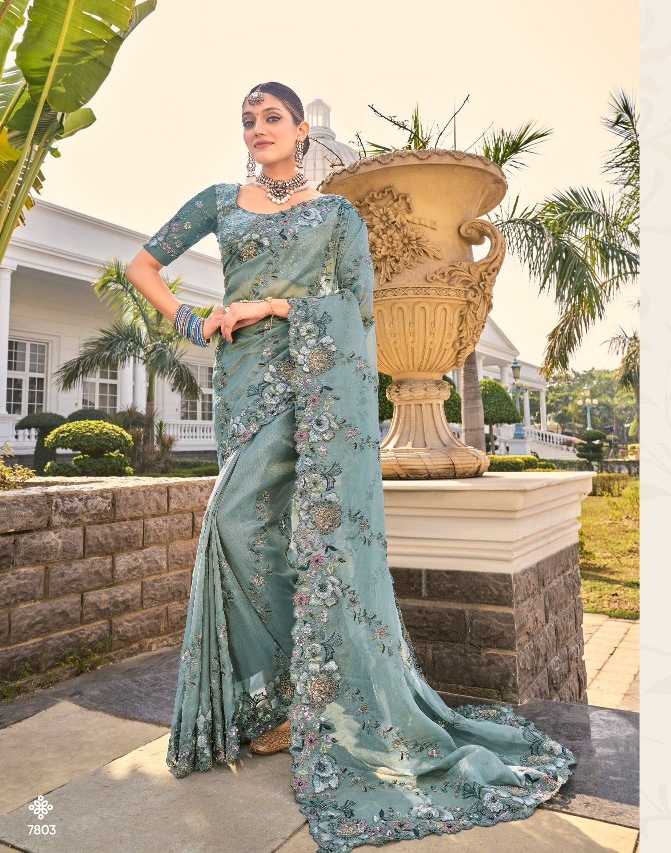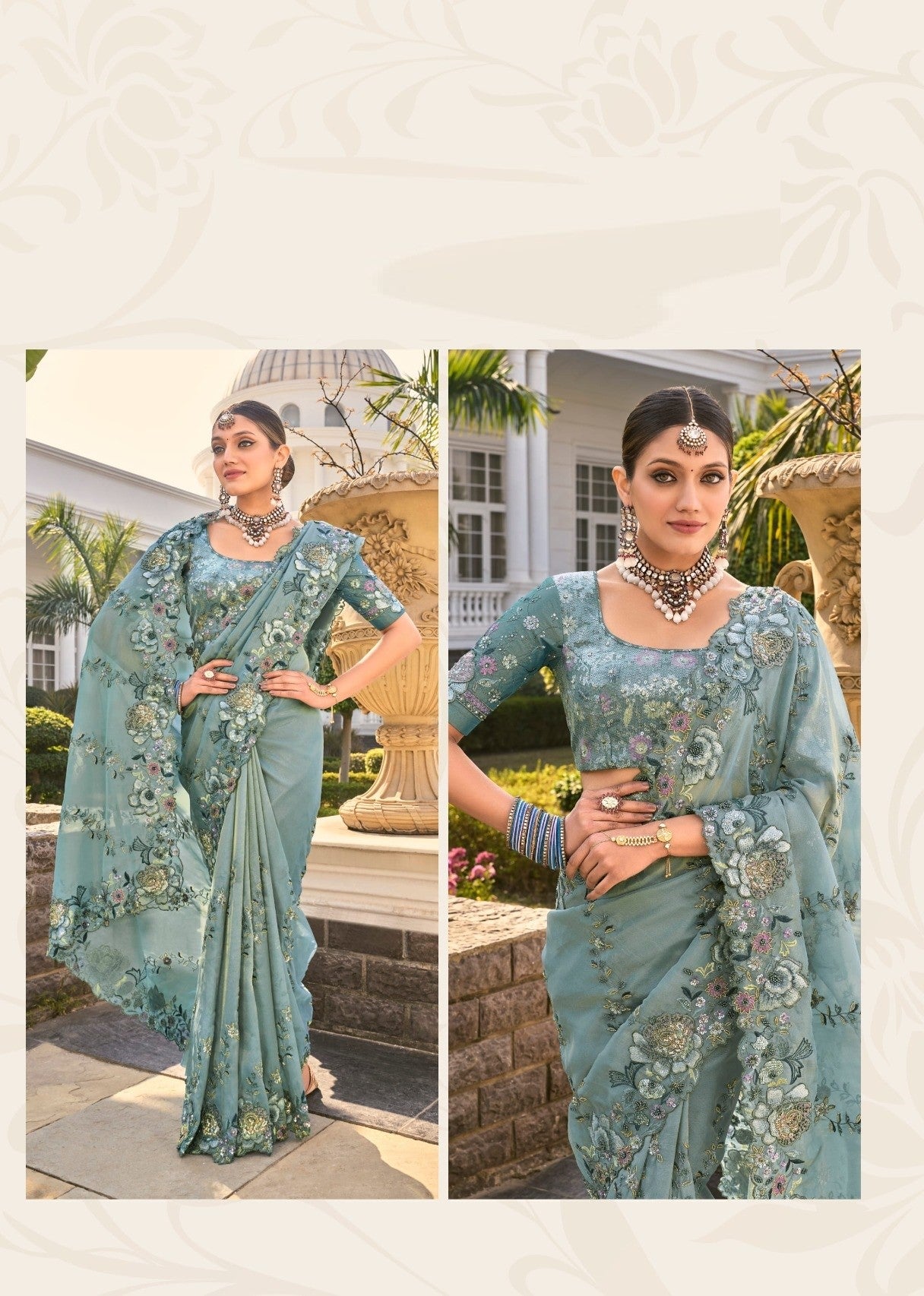 saree fabric sea green pure orgenza saree with thread ,sequence,motl ,cut-dana & jarkan heavy work 5.5 meter
