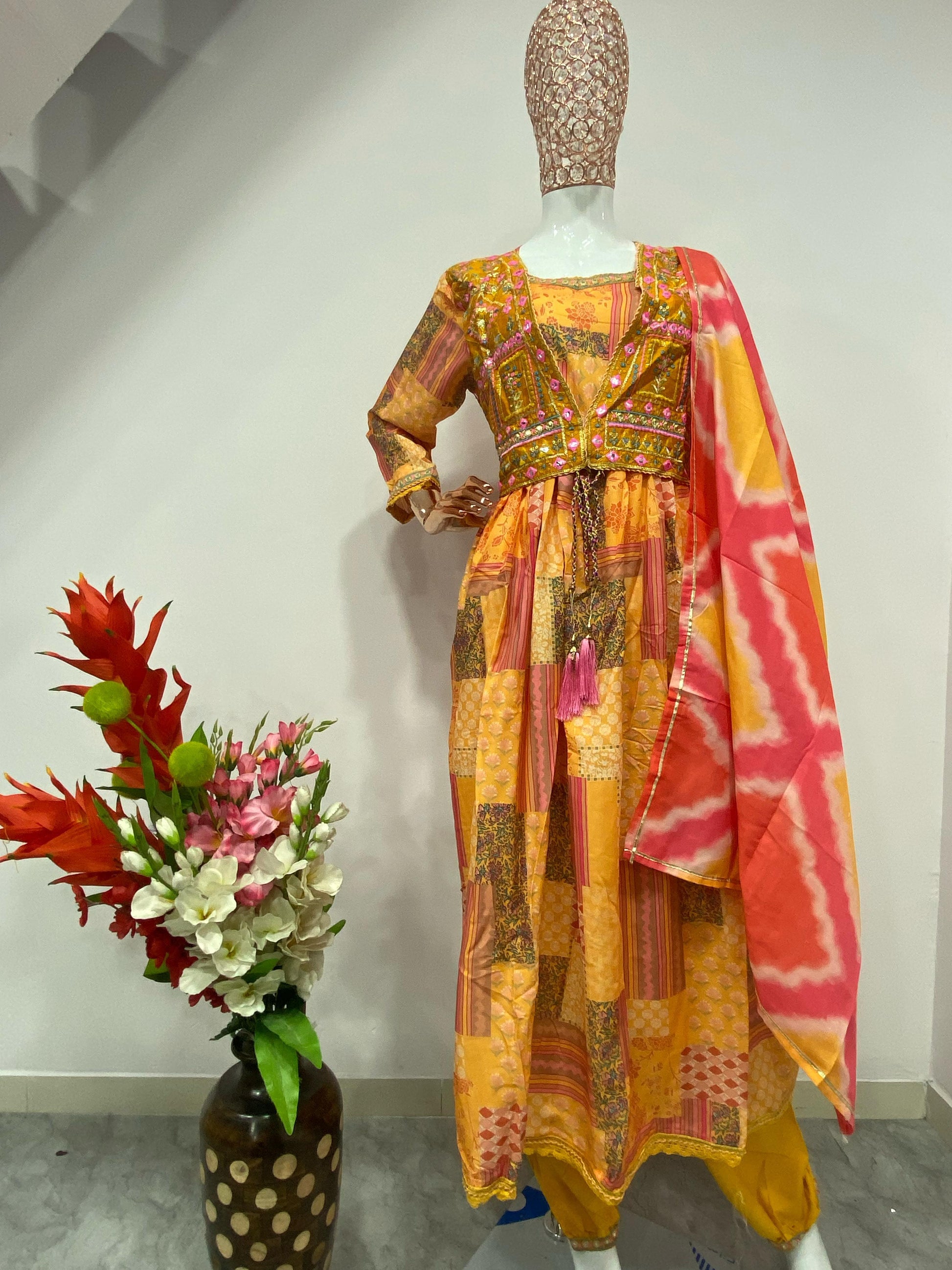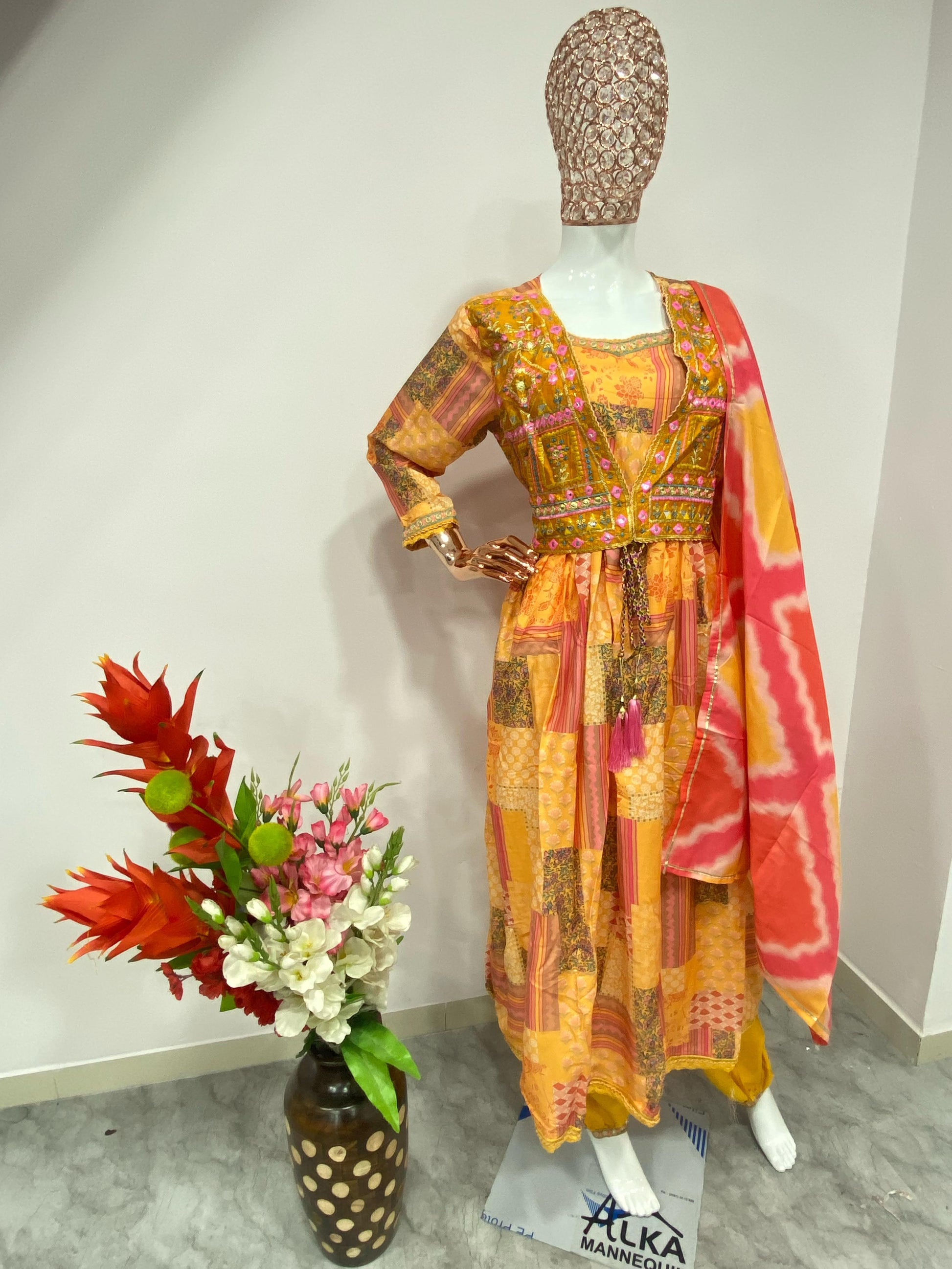Presenting Beautiful Heavy Quality Maslin Silk Fabric Designer Festive Wear Fully 2.8mtr Flair Gown And Dupatta  With Lining With Heavy Coded Zari And Multi-Coloured Thread Embroidery , Sequence And Stone  On Yoke