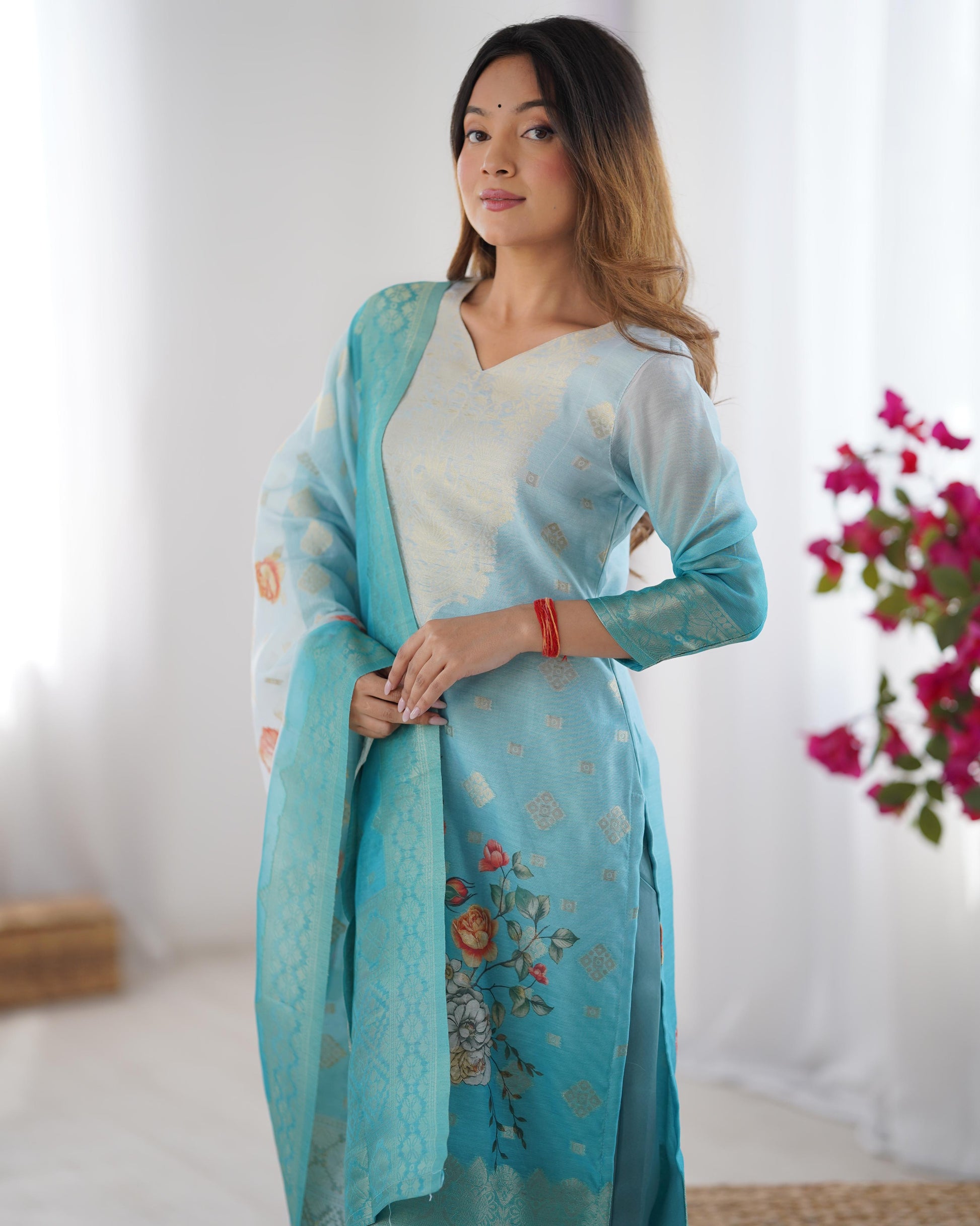 White and Sky blue Color Beautiful Chanderi Silk FAbric Dress