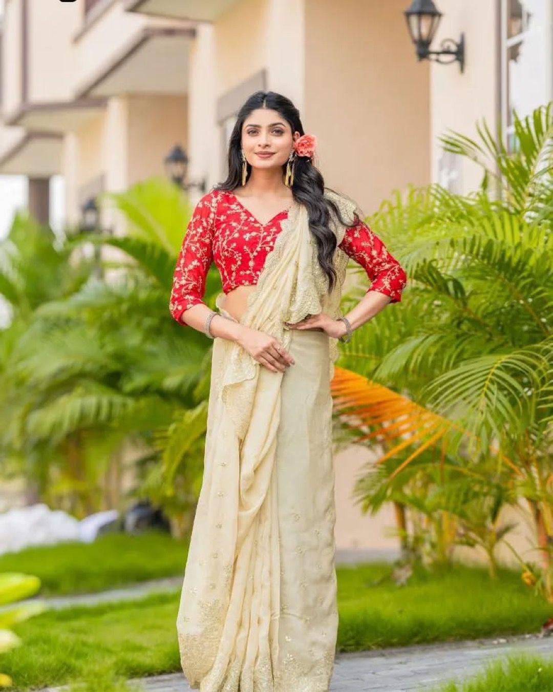 White Cream Color Orangza Saree