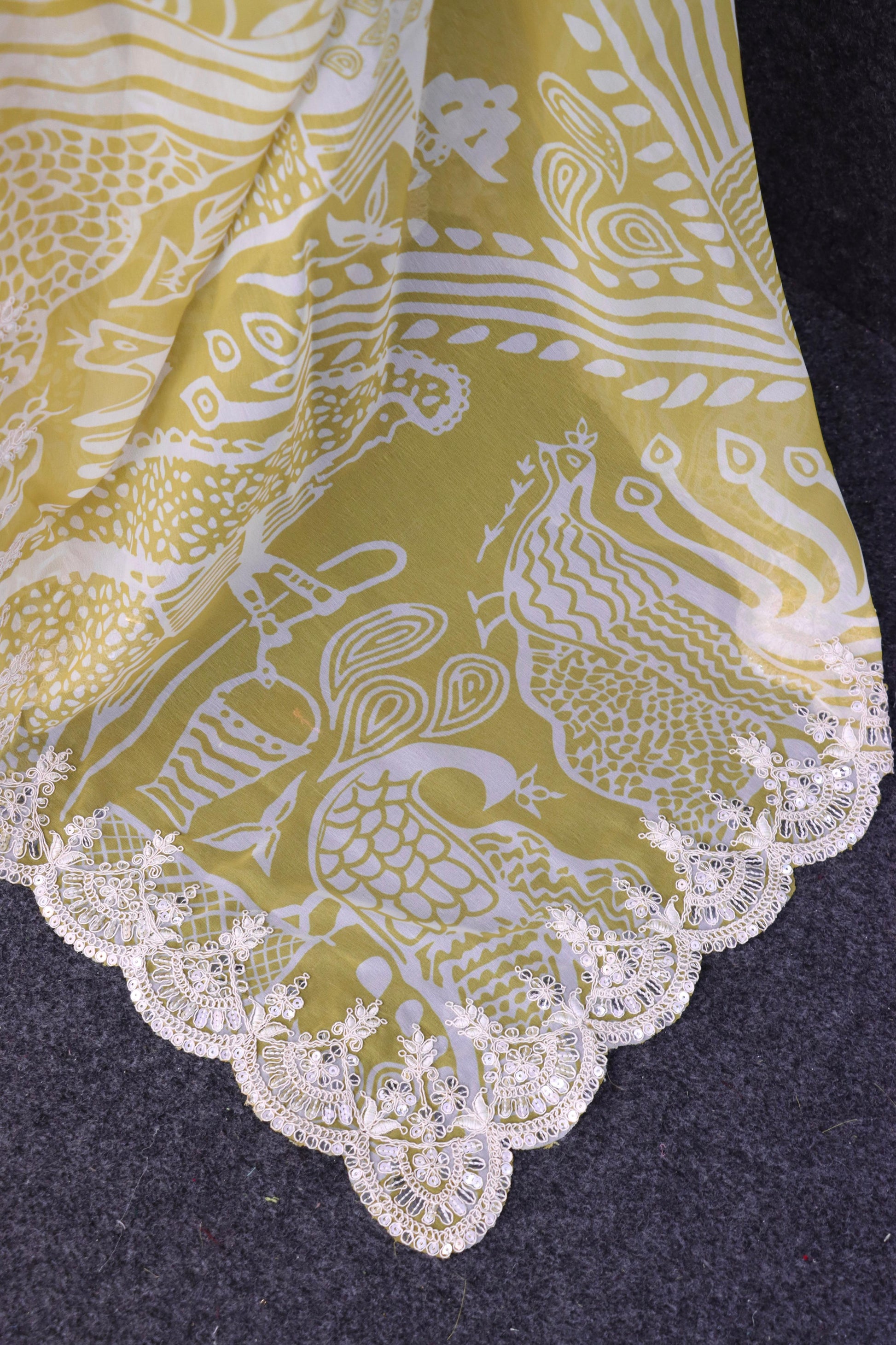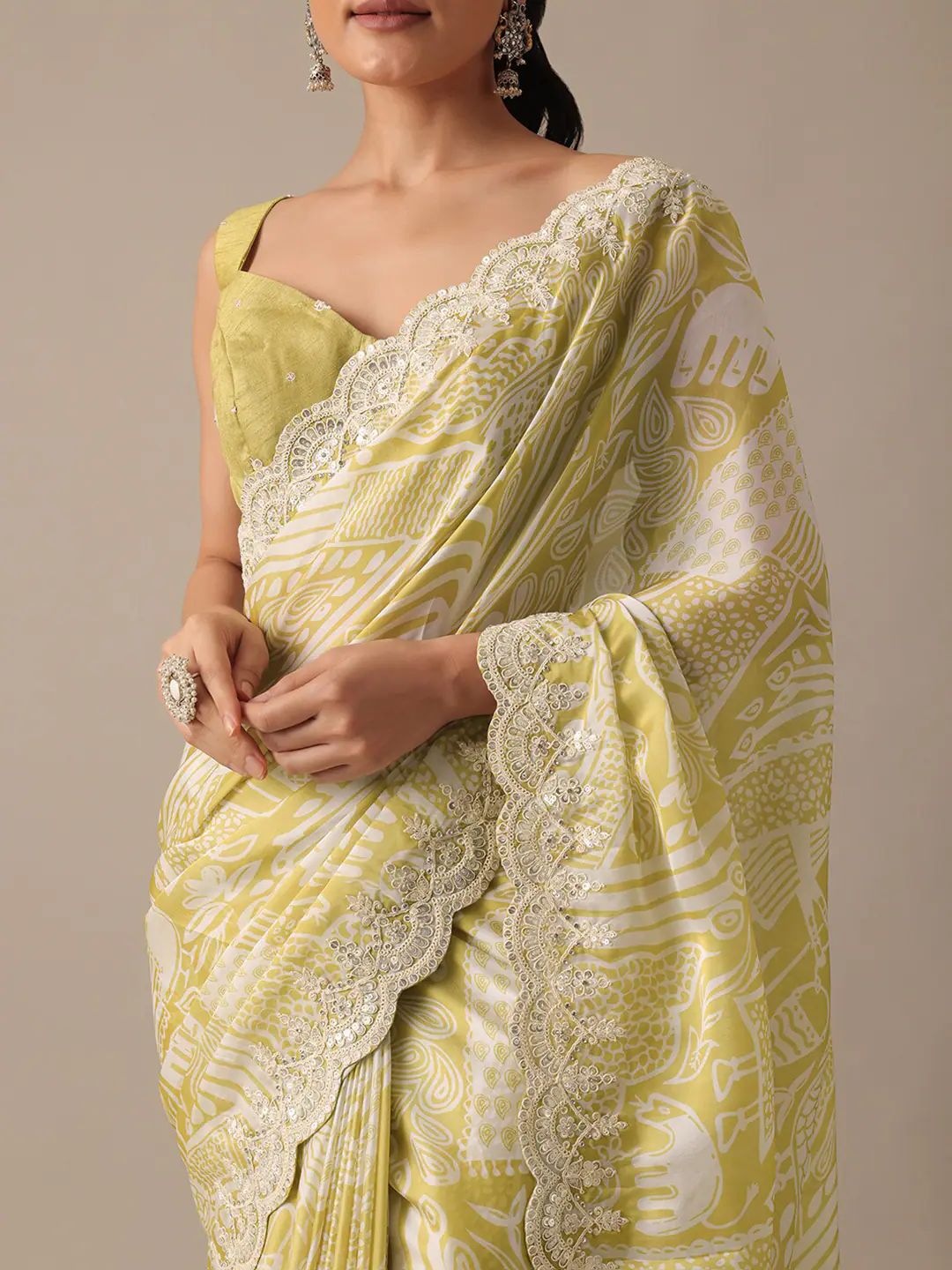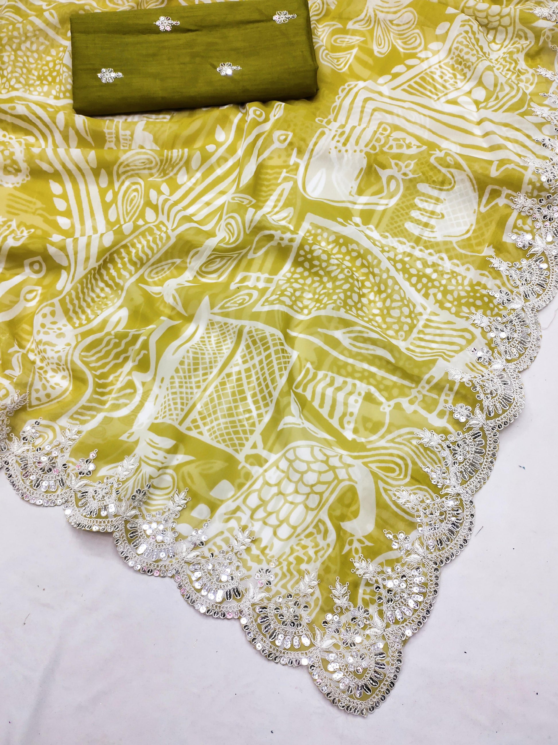 Sari Fabric: Premium Georgette With Digital Prints & Embroidery Codding & Sequins Work With Fancy Cut Work Border